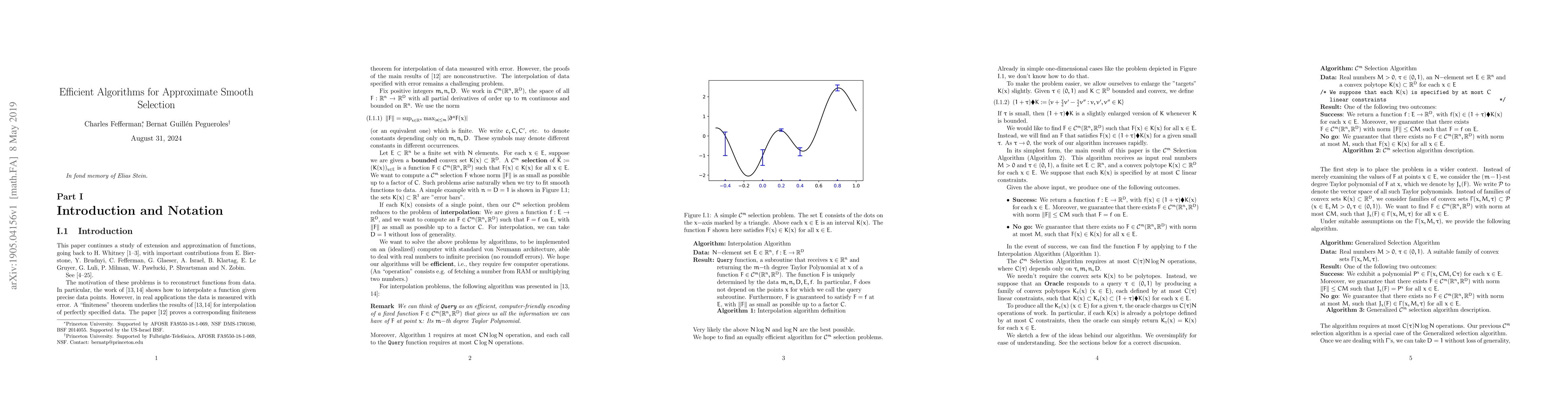 In this paper we provide efficient algorithms for approximate $\mathcal{C}^m(\mathbb{R}^n, \mathbb{R}^D)-$selection. In particular, given a set $E$, constants $M_0 > 0$ and $0 <\tau \leq \tau_{\max}$, and convex sets $K(x) \subset \mathbb{R}^D$ for $x \in E$, we show that an algorithm running in $C(\tau) N \log N$ steps is able to solve the smooth selection problem of selecting a point $y \in (1+\tau)\blacklozenge K(x)$ for $x \in E$ for an appropriate dilation of $K(x)$, $(1+\tau)\blacklozenge K(x)$, and guaranteeing that a function interpolating the points $(x, y)$ will be $\mathcal{C}^m(\mathbb{R}^n, \mathbb{R}^D)$ with norm bounded by $C M_0$.
