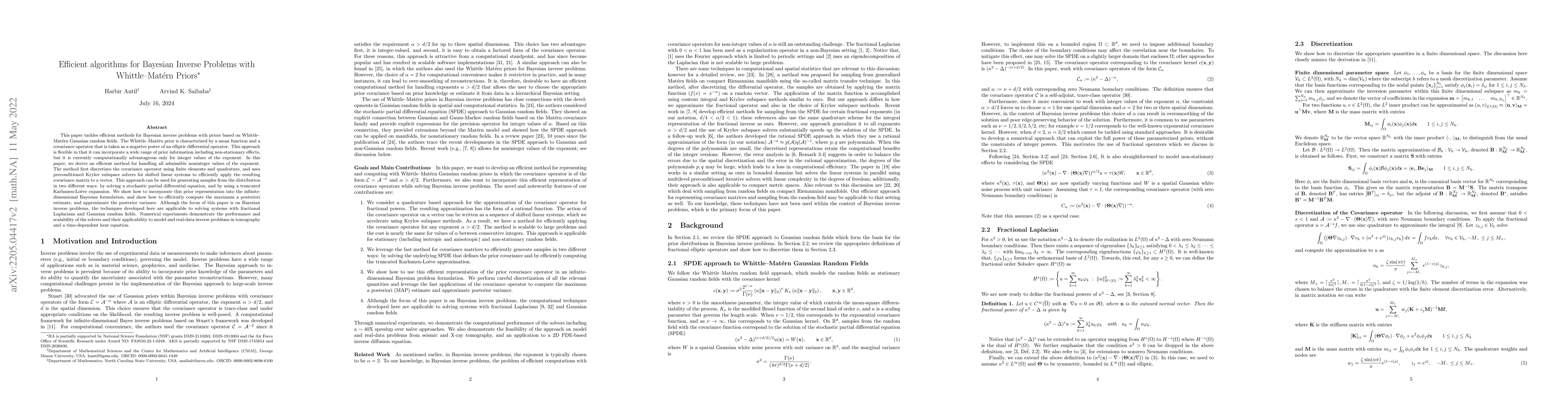 This paper develops efficient algorithms for Bayesian inverse problems using Whittle-Matérn priors, addressing non-integer values of the exponent through discretization and Krylov solvers. The method is shown to be scalable and applicable to real-data problems in tomography and heat equations.