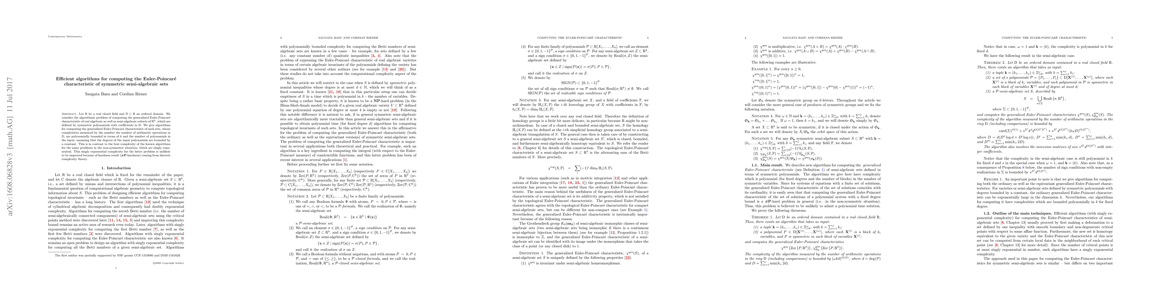 This paper presents efficient algorithms for computing the generalized Euler-Poincaré characteristic of symmetric semi-algebraic sets in real closed fields, with polynomial complexity, contrasting with the singly exponential complexity of non-symmetric cases, which is considered unlikely to improve due to $\#\mathbf{P}$-hardness.