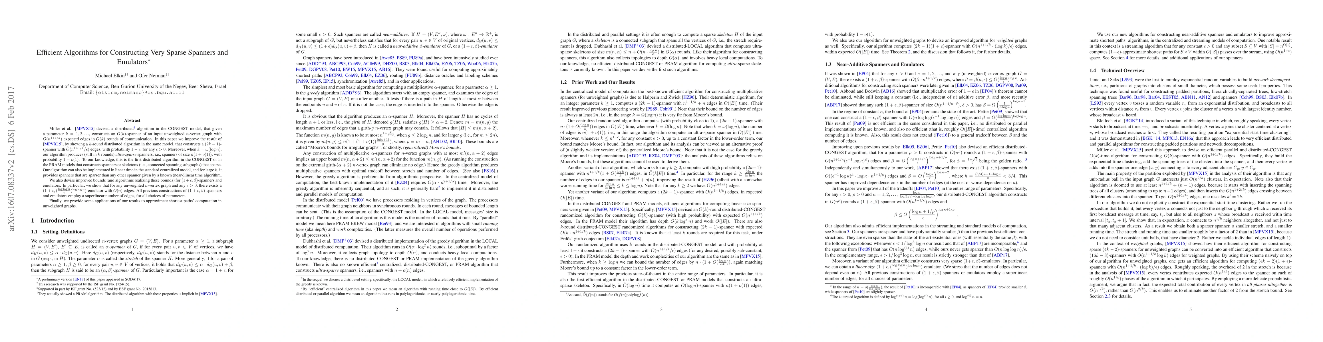 Miller et al. \cite{MPVX15} devised a distributed\footnote{They actually showed a PRAM algorithm. The distributed algorithm with these properties is implicit in \cite{MPVX15}.} algorithm in the CONGEST model, that given a parameter $k = 1,2,\ldots$, constructs an $O(k)$-spanner of an input unweighted $n$-vertex graph with $O(n^{1+1/k})$ expected edges in $O(k)$ rounds of communication. In this paper we improve the result of \cite{MPVX15}, by showing a $k$-round distributed algorithm in the same model, that constructs a $(2k-1)$-spanner with $O(n^{1+1/k}/\epsilon)$ edges, with probability $1- \epsilon$, for any $\epsilon>0$. Moreover, when $k = \omega(\log n)$, our algorithm produces (still in $k$ rounds) {\em ultra-sparse} spanners, i.e., spanners of size $n(1+ o(1))$, with probability $1- o(1)$. To our knowledge, this is the first distributed algorithm in the CONGEST or in the PRAM models that constructs spanners or skeletons (i.e., connected spanning subgraphs) that sparse. Our algorithm can also be implemented in linear time in the standard centralized model, and for large $k$, it provides spanners that are sparser than any other spanner given by a known (near-)linear time algorithm. We also devise improved bounds (and algorithms realizing these bounds) for $(1+\epsilon,\beta)$-spanners and emulators. In particular, we show that for any unweighted $n$-vertex graph and any $\epsilon > 0$, there exists a $(1+ \epsilon, ({{\log\log n} \over \epsilon})^{\log\log n})$-emulator with $O(n)$ edges. All previous constructions of $(1+\epsilon,\beta)$-spanners and emulators employ a superlinear number of edges, for all choices of parameters. Finally, we provide some applications of our results to approximate shortest paths' computation in unweighted graphs.