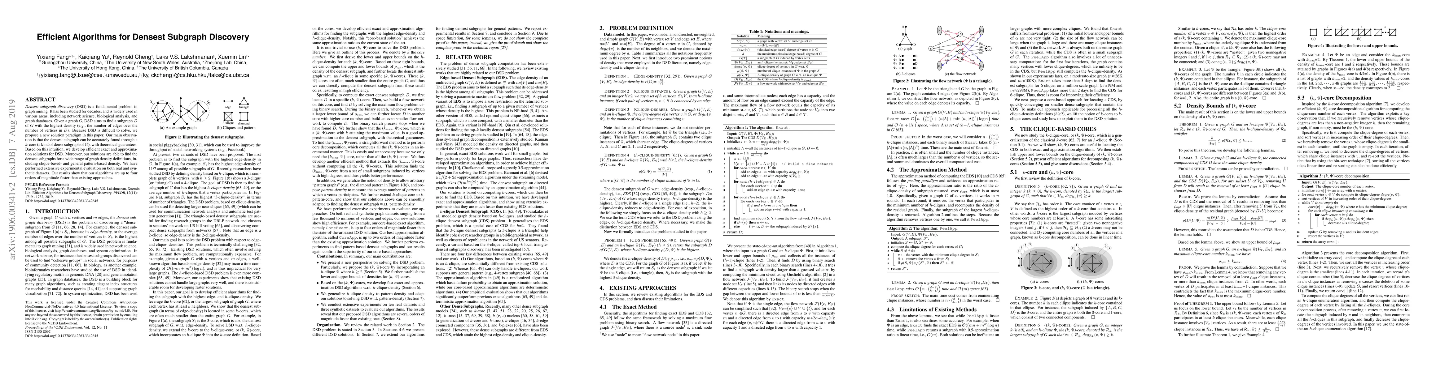 This paper proposes new efficient algorithms for discovering the densest subgraph in a given graph, leveraging k-cores to achieve significant speedups. The developed exact and approximation solutions outperform existing methods by up to four orders of magnitude, validated through experiments on eleven real datasets.