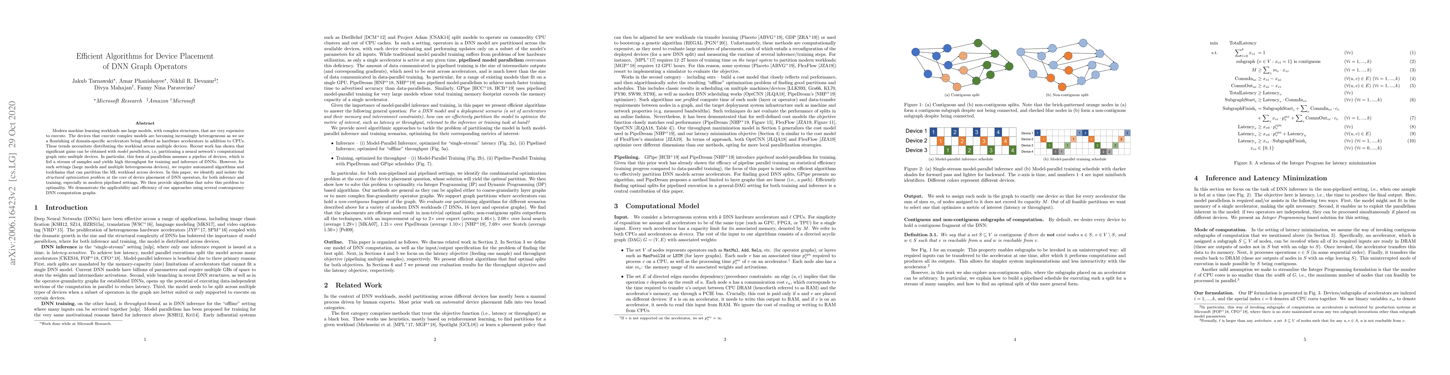 Modern machine learning workloads use large models, with complex structures, that are very expensive to execute. The devices that execute complex models are becoming increasingly heterogeneous as we see a flourishing of domain-specific accelerators being offered as hardware accelerators in addition to CPUs. These trends necessitate distributing the workload across multiple devices. Recent work has shown that significant gains can be obtained with model parallelism, i.e, partitioning a neural network's computational graph onto multiple devices. In particular, this form of parallelism assumes a pipeline of devices, which is fed a stream of samples and yields high throughput for training and inference of DNNs. However, for such settings (large models and multiple heterogeneous devices), we require automated algorithms and toolchains that can partition the ML workload across devices. In this paper, we identify and isolate the structured optimization problem at the core of device placement of DNN operators, for both inference and training, especially in modern pipelined settings. We then provide algorithms that solve this problem to optimality. We demonstrate the applicability and efficiency of our approaches using several contemporary DNN computation graphs.