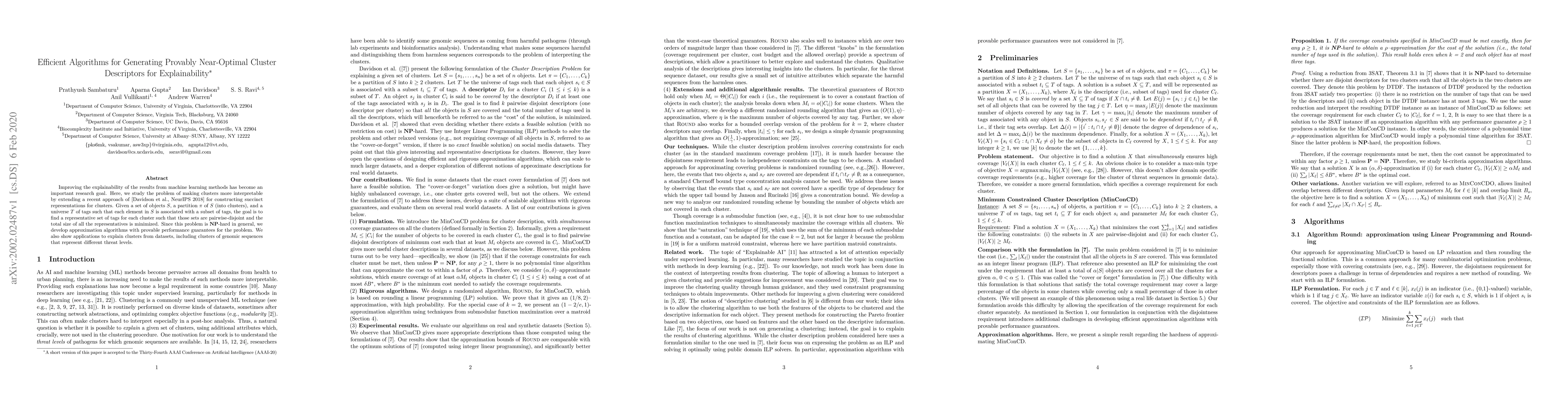 Improving the explainability of the results from machine learning methods has become an important research goal. Here, we study the problem of making clusters more interpretable by extending a recent approach of [Davidson et al., NeurIPS 2018] for constructing succinct representations for clusters. Given a set of objects $S$, a partition $\pi$ of $S$ (into clusters), and a universe $T$ of tags such that each element in $S$ is associated with a subset of tags, the goal is to find a representative set of tags for each cluster such that those sets are pairwise-disjoint and the total size of all the representatives is minimized. Since this problem is NP-hard in general, we develop approximation algorithms with provable performance guarantees for the problem. We also show applications to explain clusters from datasets, including clusters of genomic sequences that represent different threat levels.