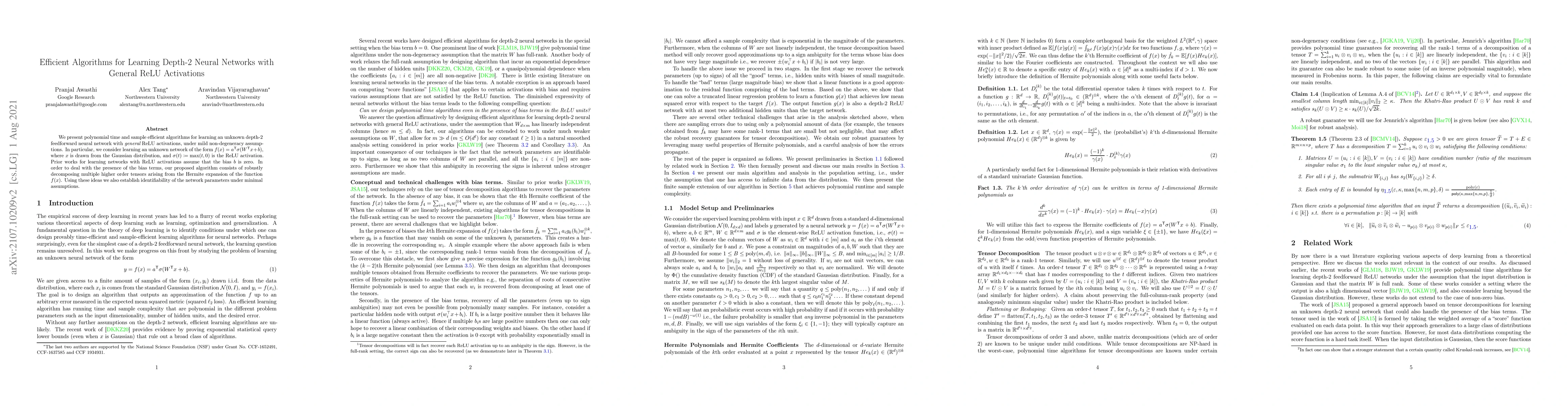 This paper introduces efficient algorithms for learning depth-2 neural networks with general ReLU activations, addressing the challenge of bias terms not assumed to be zero. The method robustly decomposes higher order tensors from the Hermite expansion, establishing network parameter identifiability under minimal assumptions.