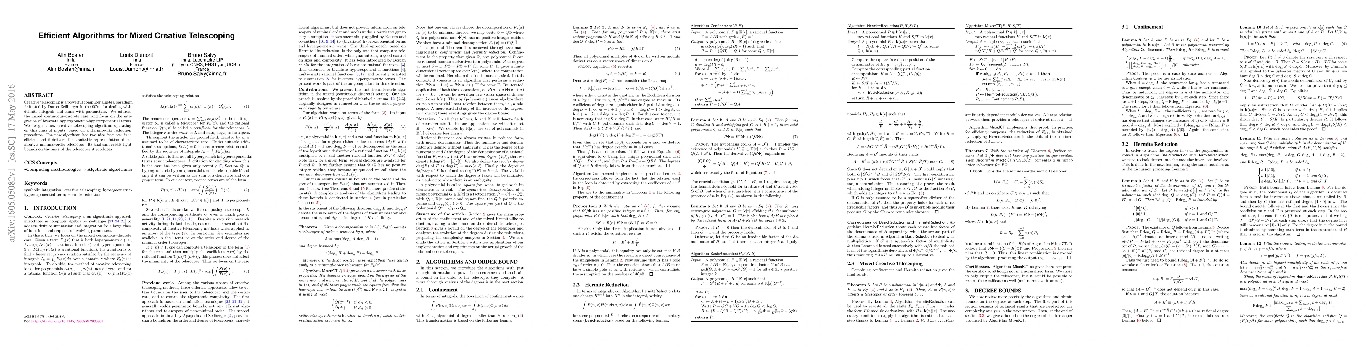Creative telescoping is a powerful computer algebra paradigm -initiated by Doron Zeilberger in the 90's- for dealing with definite integrals and sums with parameters. We address the mixed continuous-discrete case, and focus on the integration of bivariate hypergeometric-hyperexponential terms. We design a new creative telescoping algorithm operating on this class of inputs, based on a Hermite-like reduction procedure. The new algorithm has two nice features: it is efficient and it delivers, for a suitable representation of the input, a minimal-order telescoper. Its analysis reveals tight bounds on the sizes of the telescoper it produces.