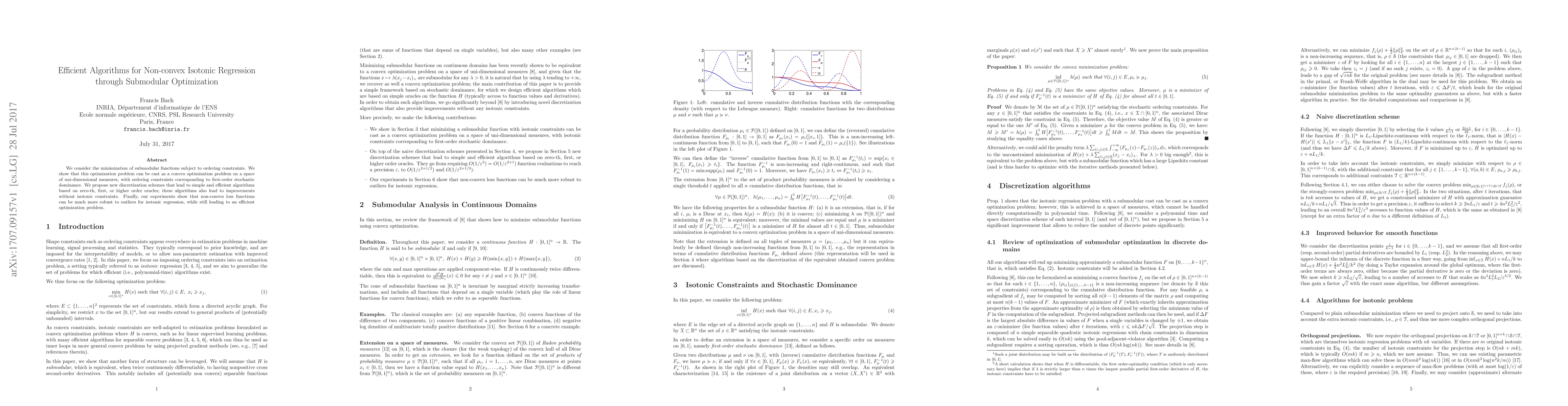 We consider the minimization of submodular functions subject to ordering constraints. We show that this optimization problem can be cast as a convex optimization problem on a space of uni-dimensional measures, with ordering constraints corresponding to first-order stochastic dominance. We propose new discretization schemes that lead to simple and efficient algorithms based on zero-th, first, or higher order oracles; these algorithms also lead to improvements without isotonic constraints. Finally, our experiments show that non-convex loss functions can be much more robust to outliers for isotonic regression, while still leading to an efficient optimization problem.