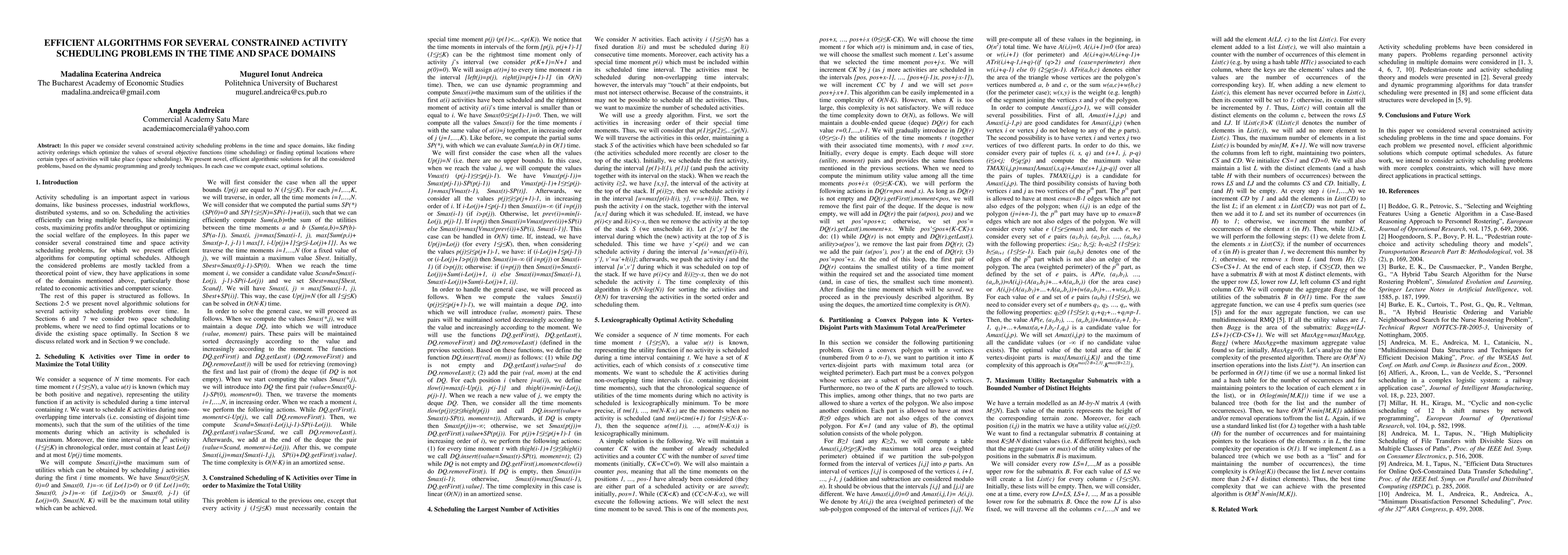 In this paper we consider several constrained activity scheduling problems in the time and space domains, like finding activity orderings which optimize the values of several objective functions (time scheduling) or finding optimal locations where certain types of activities will take place (space scheduling). We present novel, efficient algorithmic solutions for all the considered problems, based on the dynamic programming and greedy techniques. In each case we compute exact, optimal solutions.