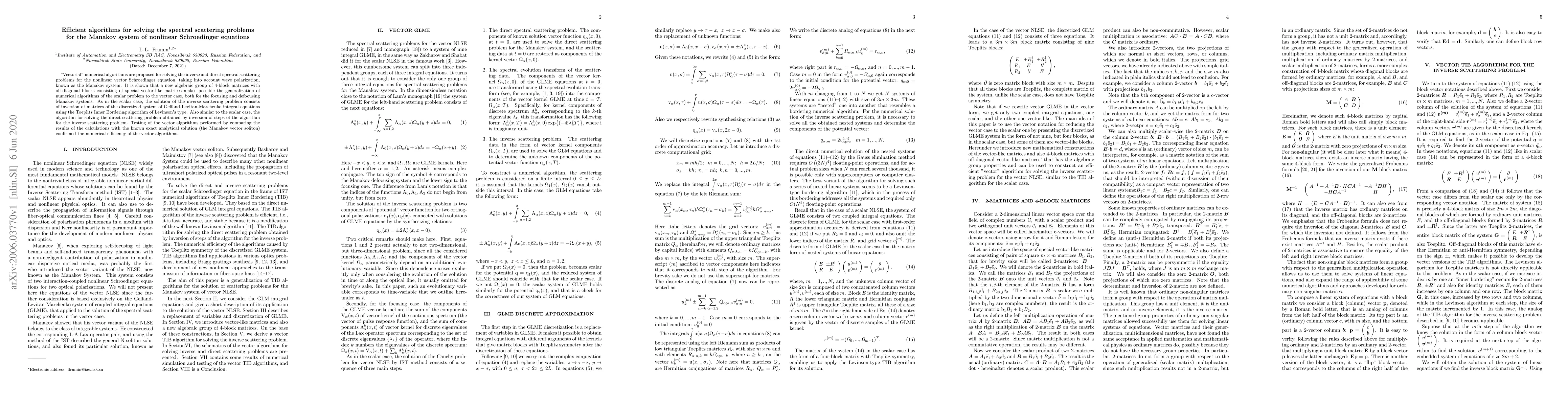 This paper proposes efficient numerical algorithms for solving the spectral scattering problems of the Manakov system of nonlinear vector Schrödinger equations, utilizing a new algebraic group of 4-block matrices to generalize scalar algorithms to the vector case. The new algorithms, tested against exact solutions, demonstrate numerical efficiency.
