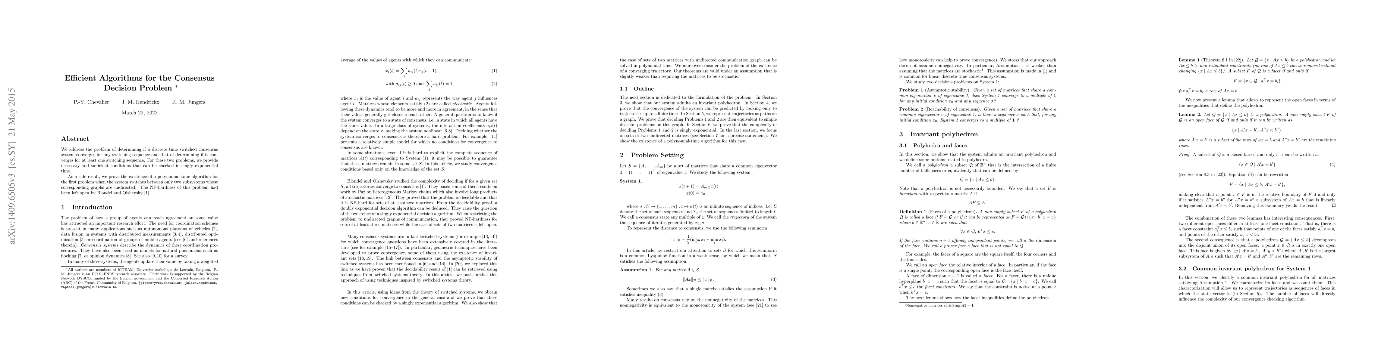 Researchers developed efficient algorithms to determine if a discrete time switched consensus system converges for any switching sequence and for at least one sequence. They also proved the existence of a polynomial-time algorithm for a specific case of two subsystems with undirected graphs.
