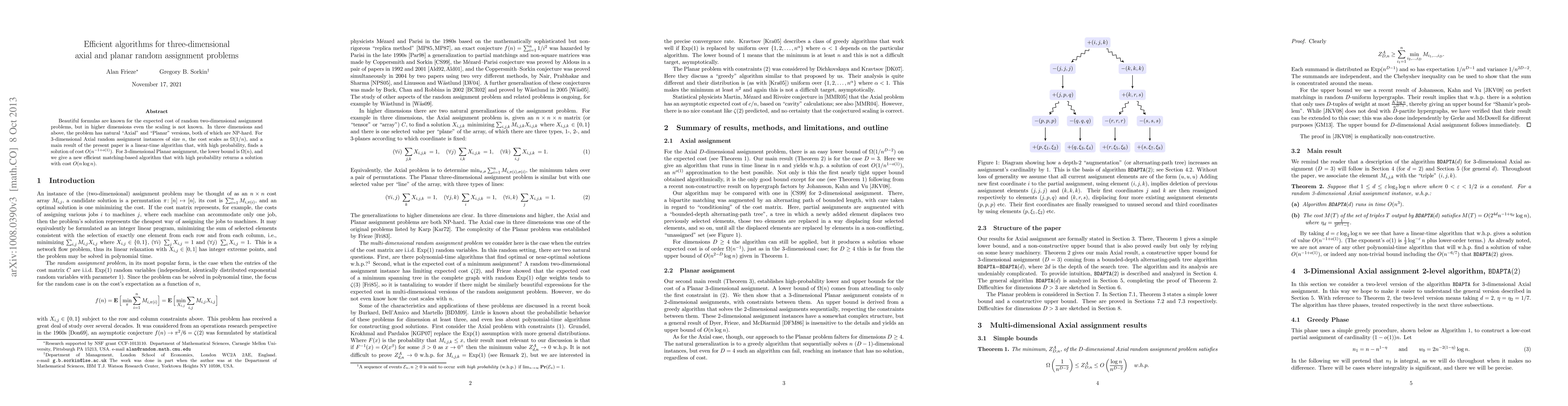 This paper presents efficient algorithms for solving the NP-hard 3-dimensional Axial and Planar random assignment problems. It introduces a linear-time algorithm for Axial assignments achieving a cost of $O(n^{-1+o(1)})$, and a matching-based algorithm for Planar assignments with a cost of $O(n \log n)$.
