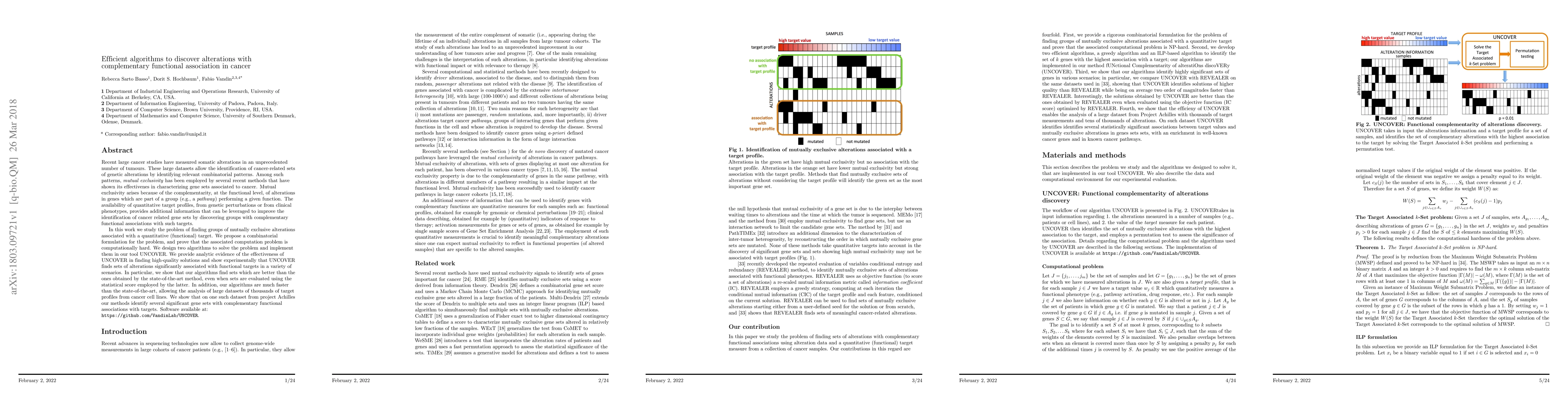 This paper proposes efficient algorithms for identifying groups of mutually exclusive genetic alterations in cancer that have complementary functional associations with quantitative targets. The authors introduce a combinatorial formulation, design two fast algorithms, and demonstrate their effectiveness and speed using the tool UNCOVER on large cancer datasets.