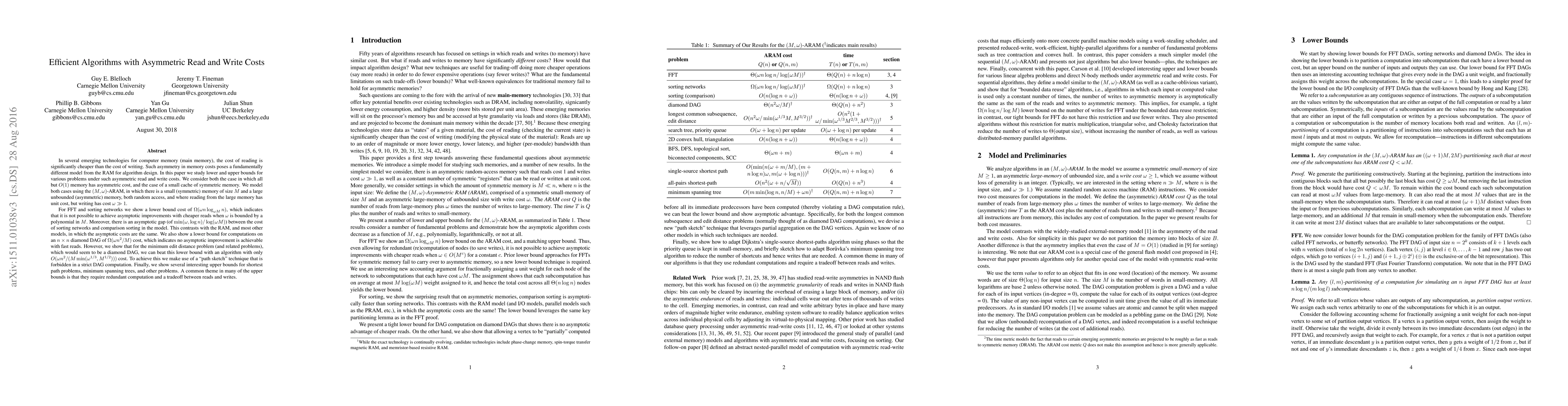 The paper studies lower and upper bounds for various problems under asymmetric read and write costs, modeling both cases using the $(M,\omega)$-ARAM, where there is a small symmetric memory of size $M$ and a large unbounded asymmetric memory.