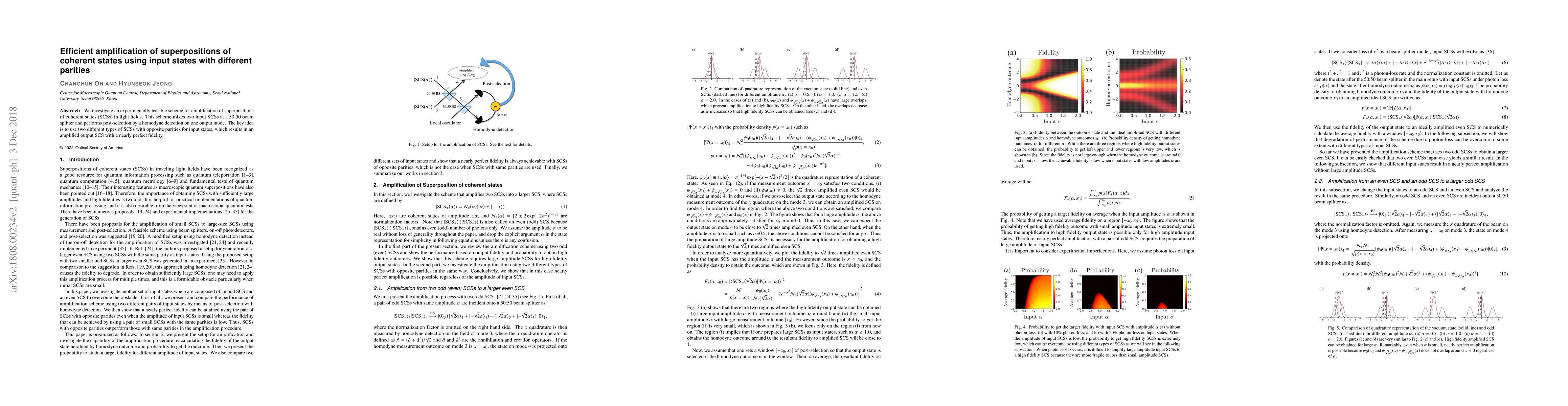 We investigate an experimentally feasible scheme for amplification of superpositions of coherent states (SCSs) in light fields. This scheme mixes two input SCSs at a 50:50 beam splitter and performs post-selection by a homodyne detection on one output mode. The key idea is to use two different types of SCSs with opposite parities for input states, which results in an amplified output SCS with a nearly perfect fidelity.