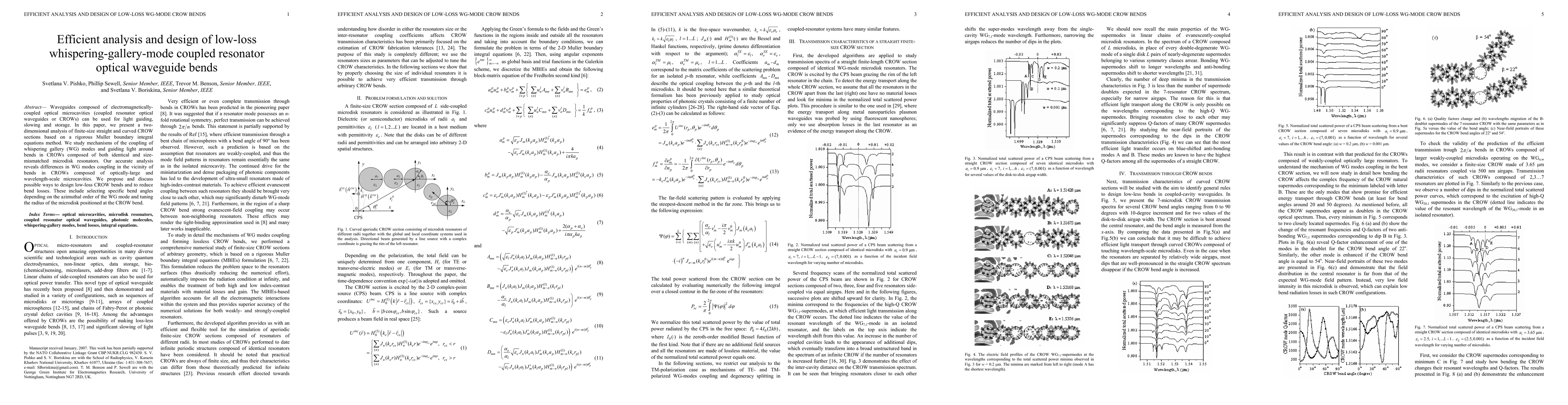 This paper presents an analysis of coupled resonator optical waveguides (CROWs) using a Muller boundary integral method, focusing on the coupling of whispering gallery (WG) modes around bends. It proposes strategies to design low-loss CROW bends, including optimizing bend angles and microdisk radii to minimize losses.