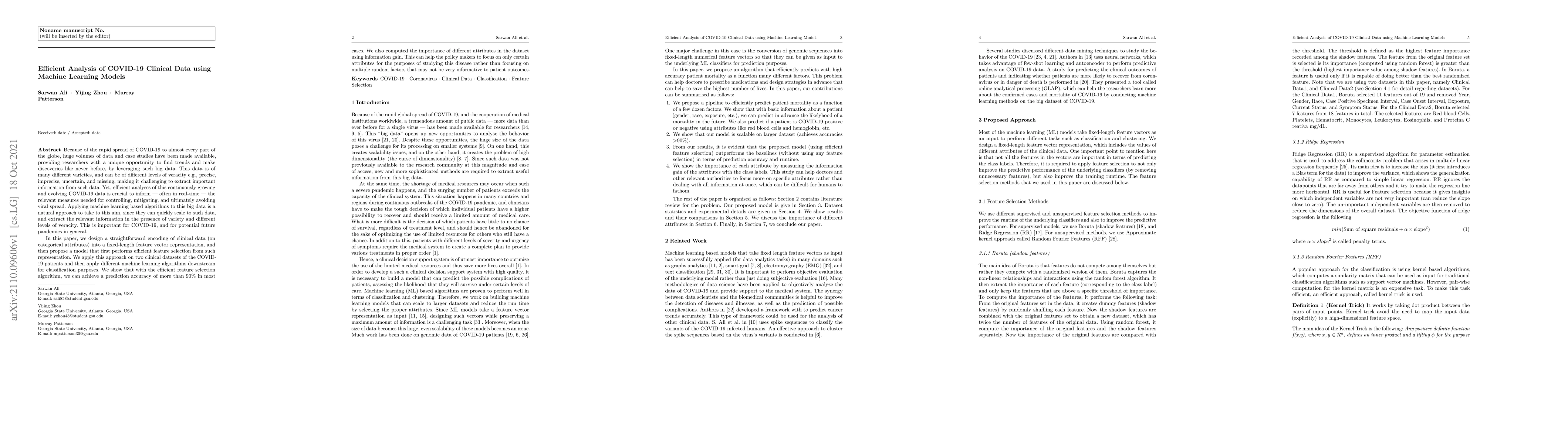 Because of the rapid spread of COVID-19 to almost every part of the globe, huge volumes of data and case studies have been made available, providing researchers with a unique opportunity to find trends and make discoveries like never before, by leveraging such big data. This data is of many different varieties, and can be of different levels of veracity e.g., precise, imprecise, uncertain, and missing, making it challenging to extract important information from such data. Yet, efficient analyses of this continuously growing and evolving COVID-19 data is crucial to inform -- often in real-time -- the relevant measures needed for controlling, mitigating, and ultimately avoiding viral spread. Applying machine learning based algorithms to this big data is a natural approach to take to this aim, since they can quickly scale to such data, and extract the relevant information in the presence of variety and different levels of veracity. This is important for COVID-19, and for potential future pandemics in general. In this paper, we design a straightforward encoding of clinical data (on categorical attributes) into a fixed-length feature vector representation, and then propose a model that first performs efficient feature selection from such representation. We apply this approach on two clinical datasets of the COVID-19 patients and then apply different machine learning algorithms downstream for classification purposes. We show that with the efficient feature selection algorithm, we can achieve a prediction accuracy of more than 90\% in most cases. We also computed the importance of different attributes in the dataset using information gain. This can help the policy makers to focus on only certain attributes for the purposes of studying this disease rather than focusing on multiple random factors that may not be very informative to patient outcomes.