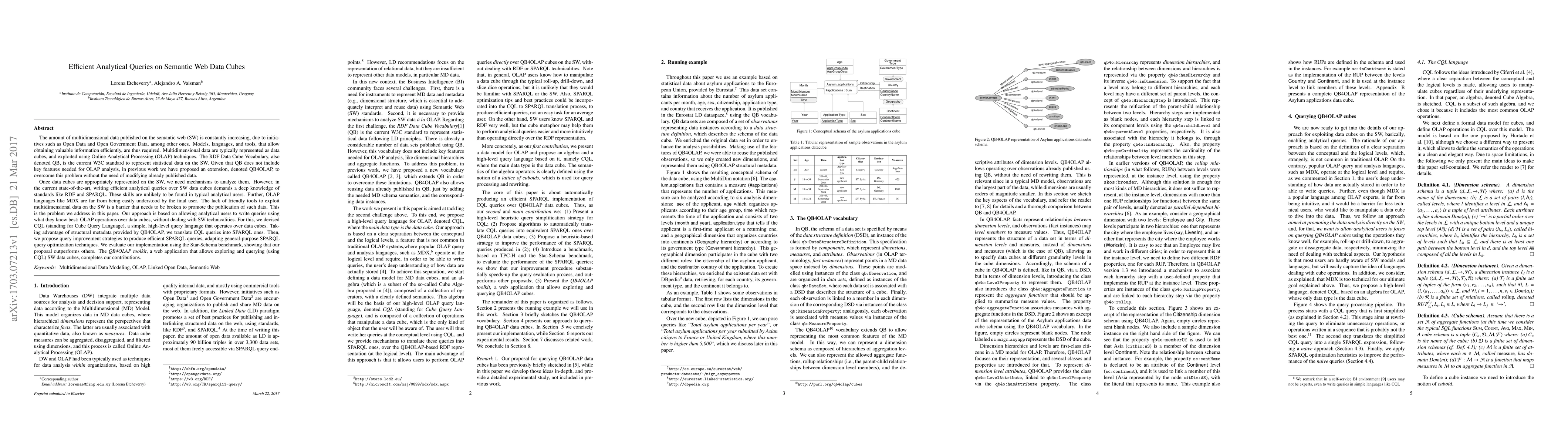 This paper proposes an extension of the QB vocabulary, QB4OLAP, to enhance multidimensional data analysis on the Semantic Web. It introduces CQL, a high-level query language for OLAP operations over data cubes, which translates into efficient SPARQL queries, overcoming the barrier of complex RDF and SPARQL knowledge for analytical users.