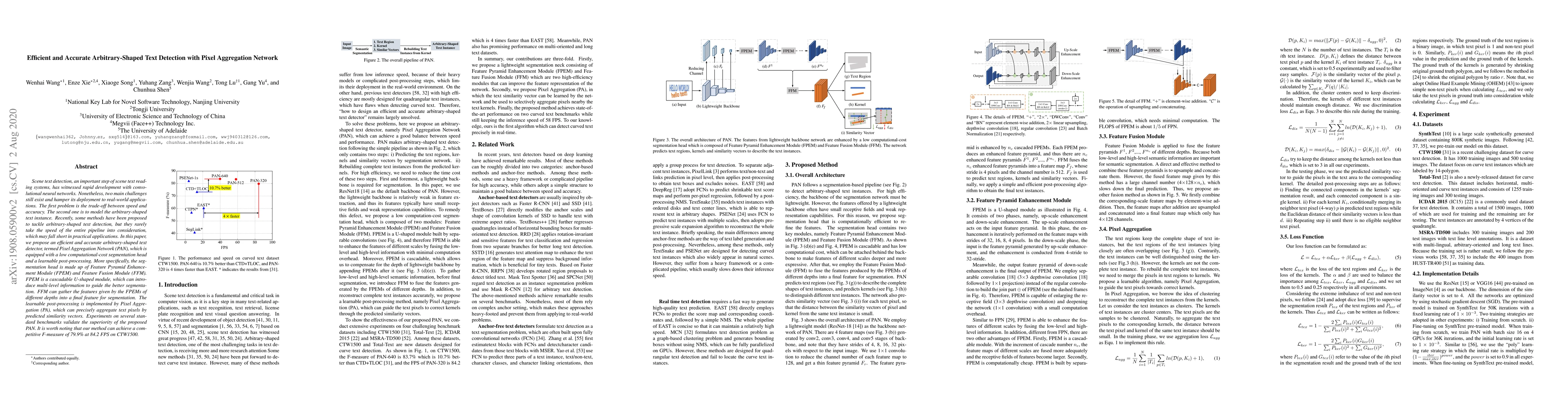 Scene text detection, an important step of scene text reading systems, has witnessed rapid development with convolutional neural networks. Nonetheless, two main challenges still exist and hamper its deployment to real-world applications. The first problem is the trade-off between speed and accuracy. The second one is to model the arbitrary-shaped text instance. Recently, some methods have been proposed to tackle arbitrary-shaped text detection, but they rarely take the speed of the entire pipeline into consideration, which may fall short in practical applications.In this paper, we propose an efficient and accurate arbitrary-shaped text detector, termed Pixel Aggregation Network (PAN), which is equipped with a low computational-cost segmentation head and a learnable post-processing. More specifically, the segmentation head is made up of Feature Pyramid Enhancement Module (FPEM) and Feature Fusion Module (FFM). FPEM is a cascadable U-shaped module, which can introduce multi-level information to guide the better segmentation. FFM can gather the features given by the FPEMs of different depths into a final feature for segmentation. The learnable post-processing is implemented by Pixel Aggregation (PA), which can precisely aggregate text pixels by predicted similarity vectors. Experiments on several standard benchmarks validate the superiority of the proposed PAN. It is worth noting that our method can achieve a competitive F-measure of 79.9% at 84.2 FPS on CTW1500.