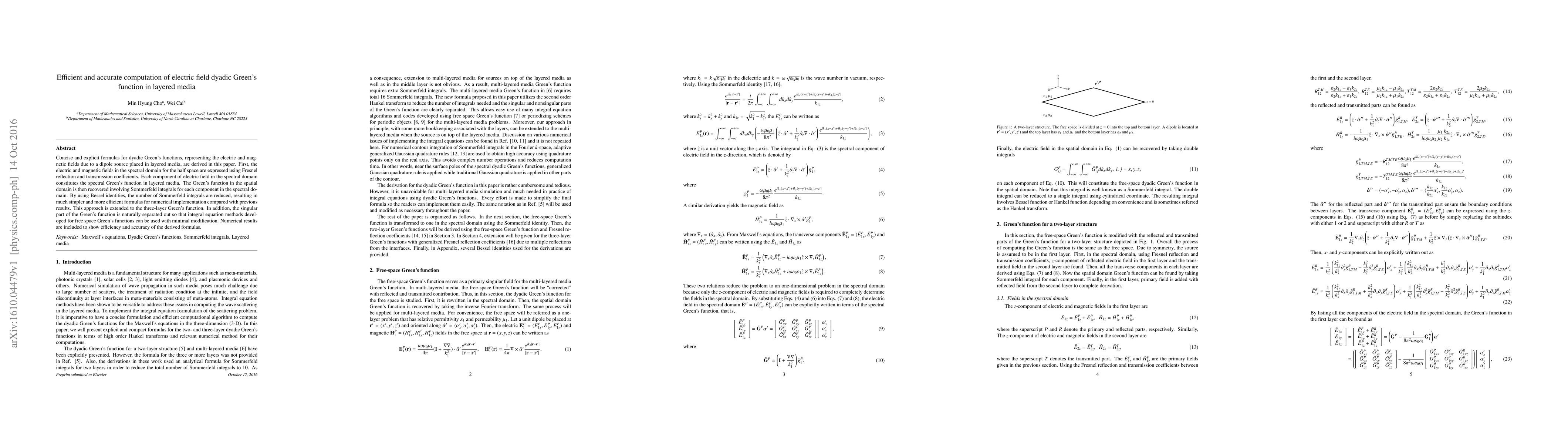This paper derives efficient formulas for dyadic Green's functions in layered media, using spectral domain expressions and Bessel identities to simplify Sommerfeld integrals. The approach extends to three-layer configurations and maintains accuracy for numerical implementations.