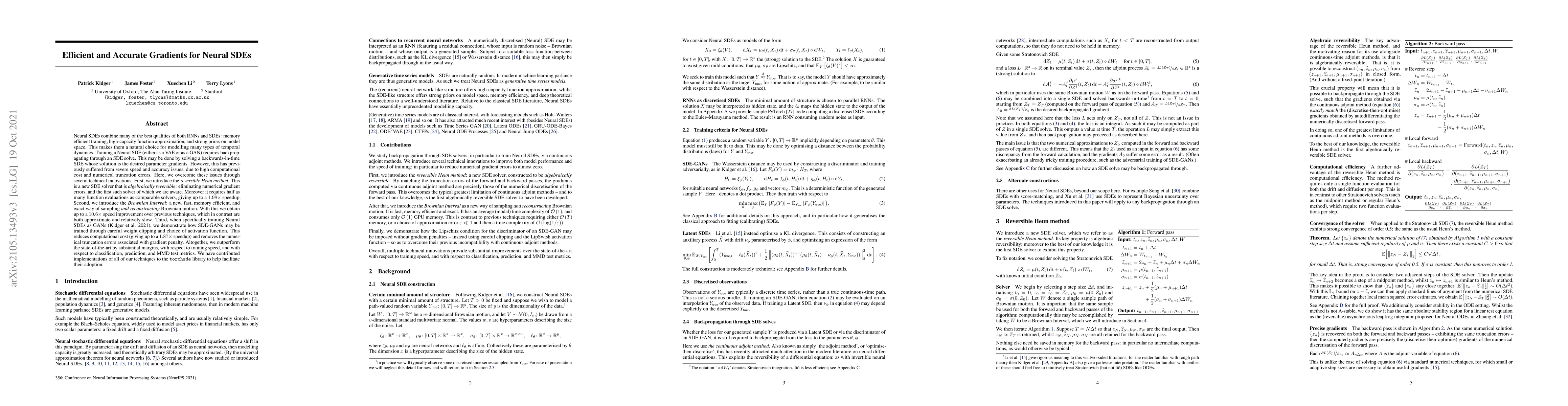 This paper presents technical innovations to efficiently and accurately train Neural Stochastic Differential Equations (SDEs), including a reversible Heun method for SDE solving, a fast Brownian Interval technique, and weight clipping for GAN training, achieving significant speedups and outperforming state-of-the-art methods.