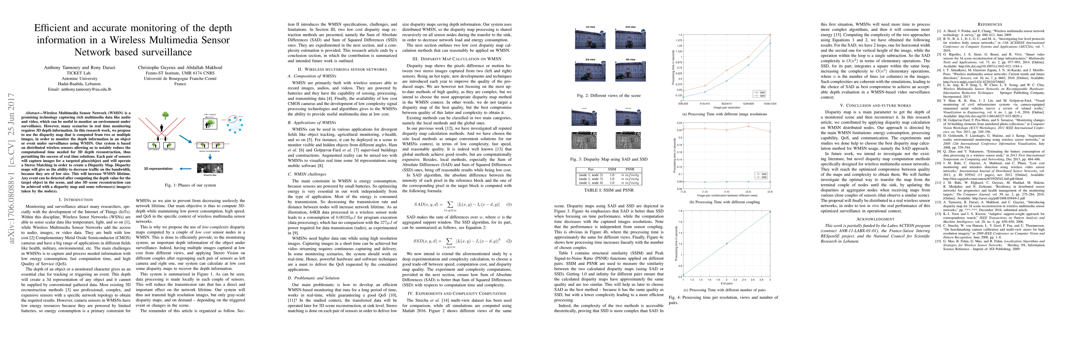 Wireless Multimedia Sensor Network (WMSN) is a promising technology capturing rich multimedia data like audio and video, which can be useful to monitor an environment under surveillance. However, many scenarios in real time monitoring requires 3D depth information. In this research work, we propose to use the disparity map that is computed from two or multiple images, in order to monitor the depth information in an object or event under surveillance using WMSN. Our system is based on distributed wireless sensors allowing us to notably reduce the computational time needed for 3D depth reconstruction, thus permitting the success of real time solutions. Each pair of sensors will capture images for a targeted place/object and will operate a Stereo Matching in order to create a Disparity Map. Disparity maps will give us the ability to decrease traffic on the bandwidth, because they are of low size. This will increase WMSN lifetime. Any event can be detected after computing the depth value for the target object in the scene, and also 3D scene reconstruction can be achieved with a disparity map and some reference(s) image(s) taken by the node(s).