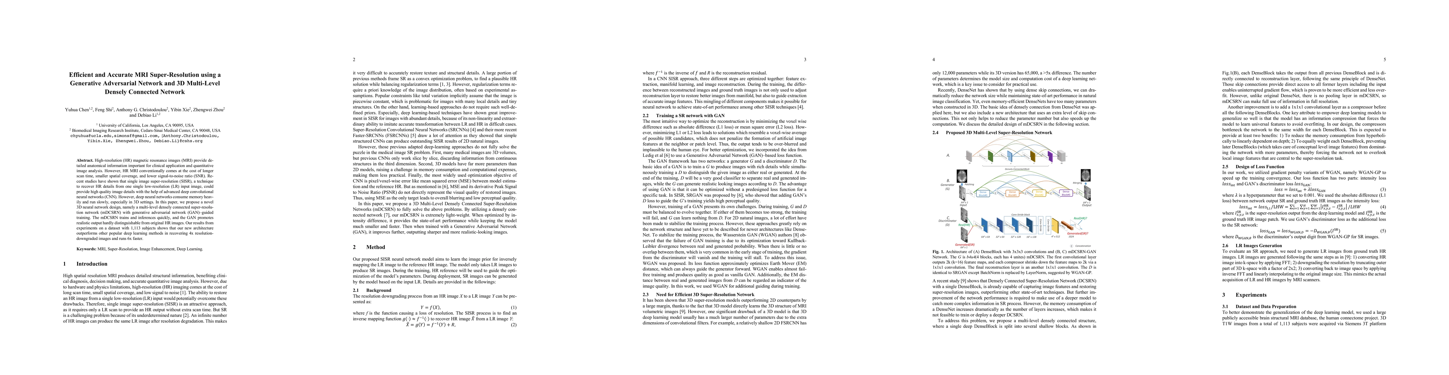 This research introduces a novel 3D neural network, the multi-level densely connected super-resolution network (mDCSRN), combined with generative adversarial network (GAN)-guided training to enhance MRI super-resolution. The proposed method achieves high-quality, high-resolution MRI reconstructions from low-resolution inputs, significantly faster than other deep learning methods, while maintaining high accuracy and realistic image details. For detailed insights, refer to the original paper.