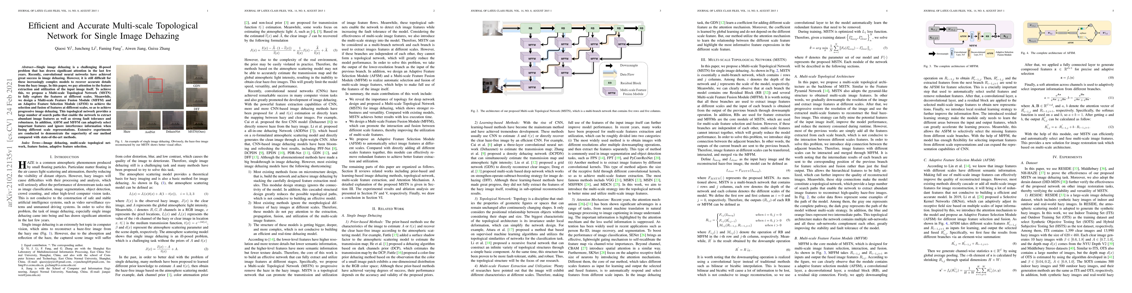 This paper proposes a Multi-scale Topological Network (MSTN) for single image dehazing, utilizing a Multi-scale Feature Fusion Module (MFFM) and Adaptive Feature Selection Module (AFSM) to extract and fuse features at different scales. The MSTN demonstrates superior performance in recovering image details compared to state-of-the-art methods.