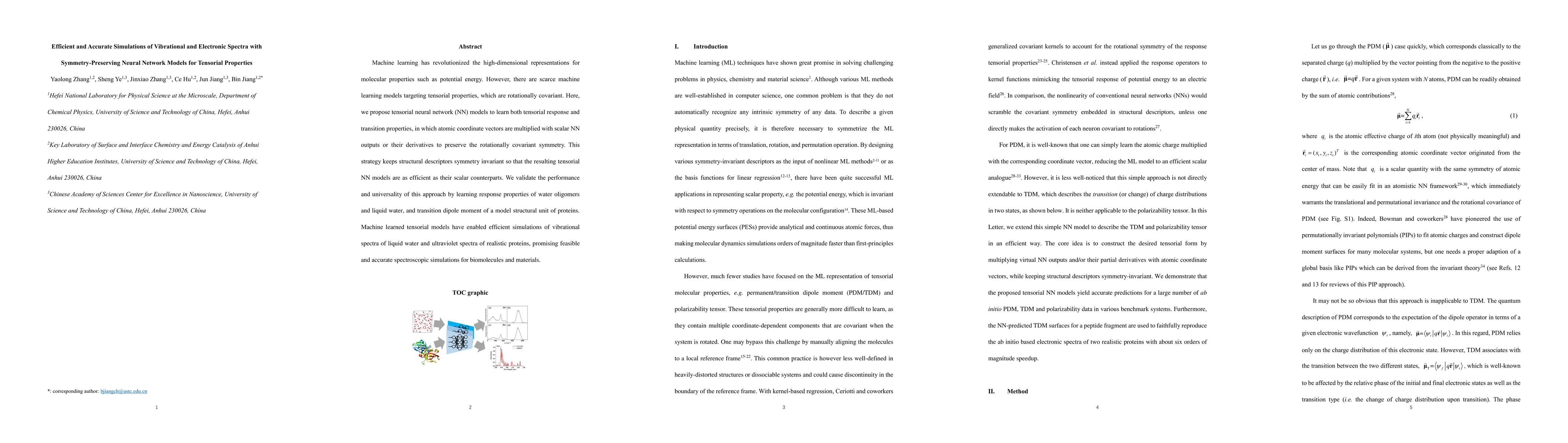 This paper proposes tensorial neural network models to efficiently simulate vibrational and electronic spectra by preserving rotational symmetry, demonstrating their effectiveness in predicting properties of water oligomers, liquid water, and proteins. The approach enables accurate spectroscopic simulations for biomolecules and materials.