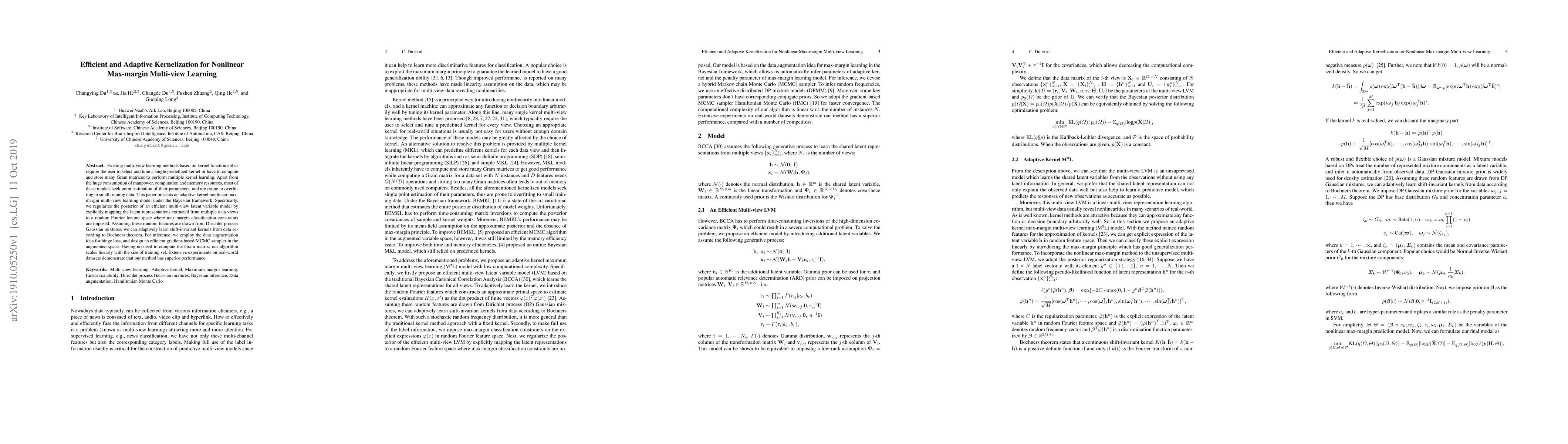 Existing multi-view learning methods based on kernel function either require the user to select and tune a single predefined kernel or have to compute and store many Gram matrices to perform multiple kernel learning. Apart from the huge consumption of manpower, computation and memory resources, most of these models seek point estimation of their parameters, and are prone to overfitting to small training data. This paper presents an adaptive kernel nonlinear max-margin multi-view learning model under the Bayesian framework. Specifically, we regularize the posterior of an efficient multi-view latent variable model by explicitly mapping the latent representations extracted from multiple data views to a random Fourier feature space where max-margin classification constraints are imposed. Assuming these random features are drawn from Dirichlet process Gaussian mixtures, we can adaptively learn shift-invariant kernels from data according to Bochners theorem. For inference, we employ the data augmentation idea for hinge loss, and design an efficient gradient-based MCMC sampler in the augmented space. Having no need to compute the Gram matrix, our algorithm scales linearly with the size of training set. Extensive experiments on real-world datasets demonstrate that our method has superior performance.