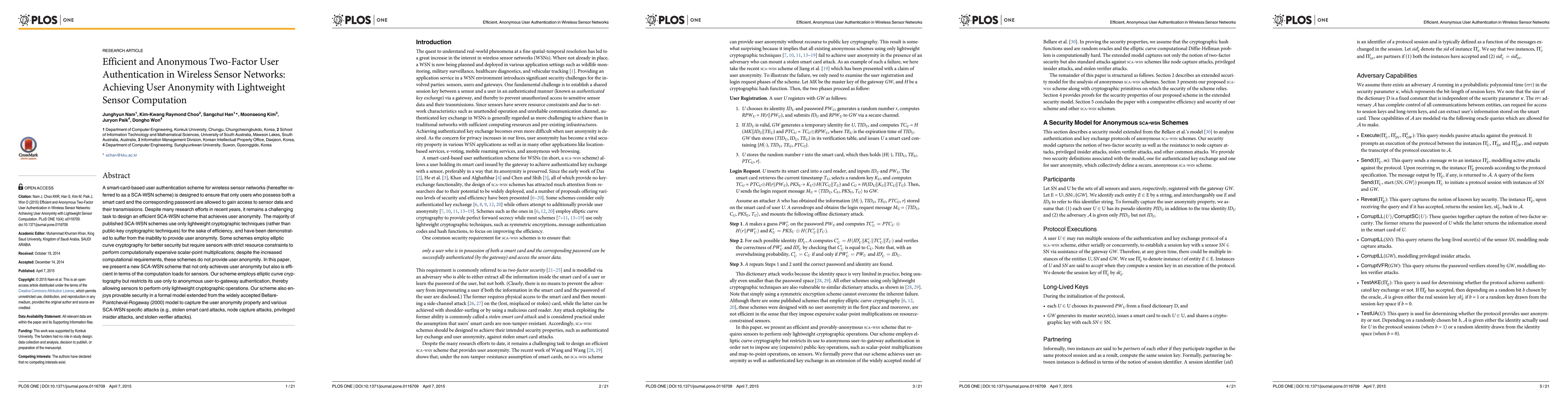 This paper proposes a smart-card-based two-factor authentication scheme for wireless sensor networks that achieves user anonymity while maintaining efficient sensor computation. The scheme uses elliptic curve cryptography for anonymous user-to-gateway authentication, allowing sensors to perform lightweight operations, and is proven secure against various attacks.