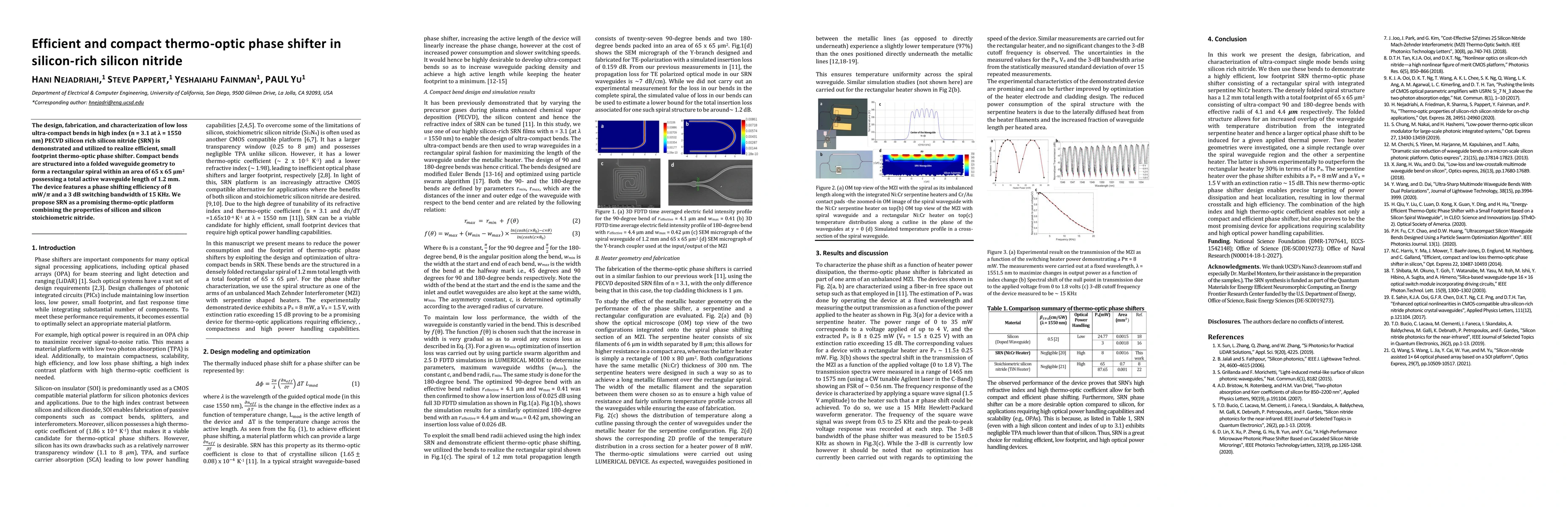 The paper presents an efficient, compact thermo-optic phase shifter using silicon-rich silicon nitride (SRN) with low-loss ultra-compact bends. The device, featuring a small footprint of 65 x 65 µm², achieves a phase shifting efficiency of 8 mW/π and a 3 dB switching bandwidth of 15 kHz.