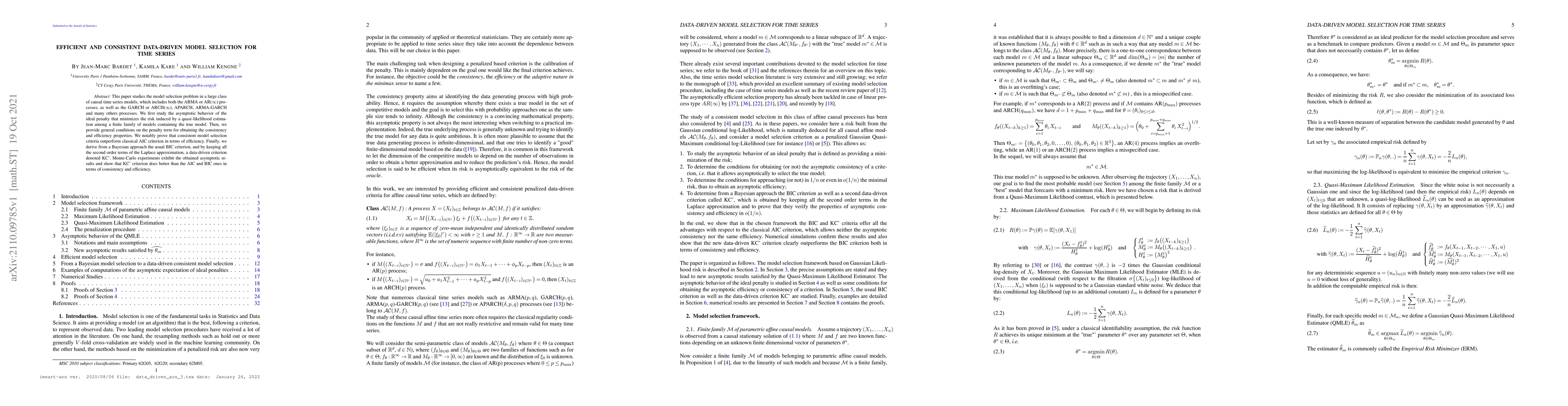 This paper develops efficient and consistent model selection criteria for a wide range of time series models, proving that the proposed KC' criterion outperforms traditional AIC and BIC in both consistency and efficiency, as demonstrated by Monte-Carlo experiments.