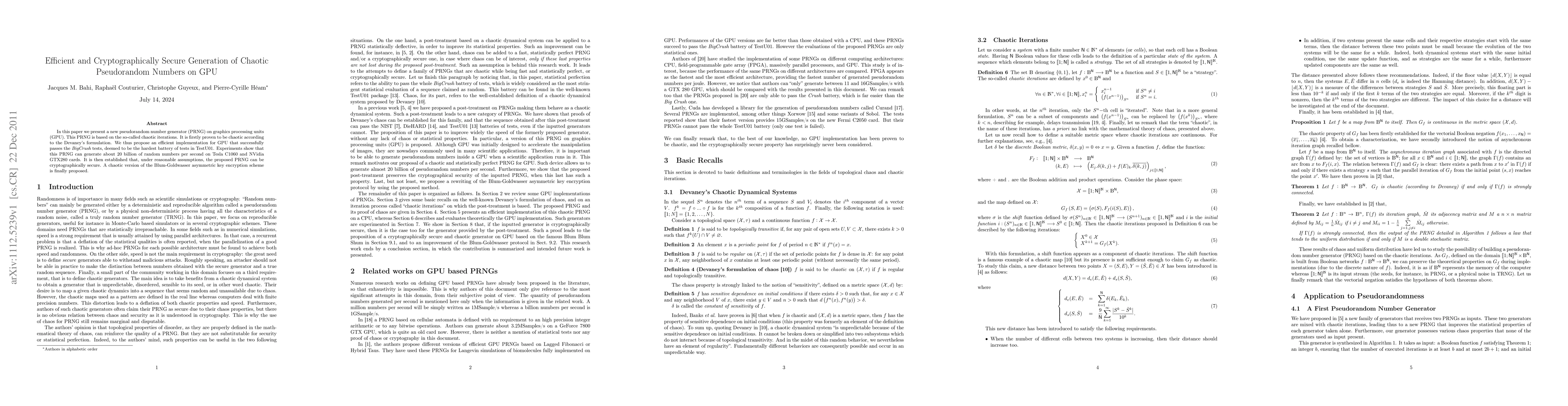 This paper presents a GPU-based pseudorandom number generator (PRNG) based on chaotic iterations, proven to be chaotic and passing the rigorous BigCrush tests. It demonstrates cryptographic security and achieves high-speed generation of random numbers, proposing a chaotic version of the Blum-Goldwasser encryption scheme.