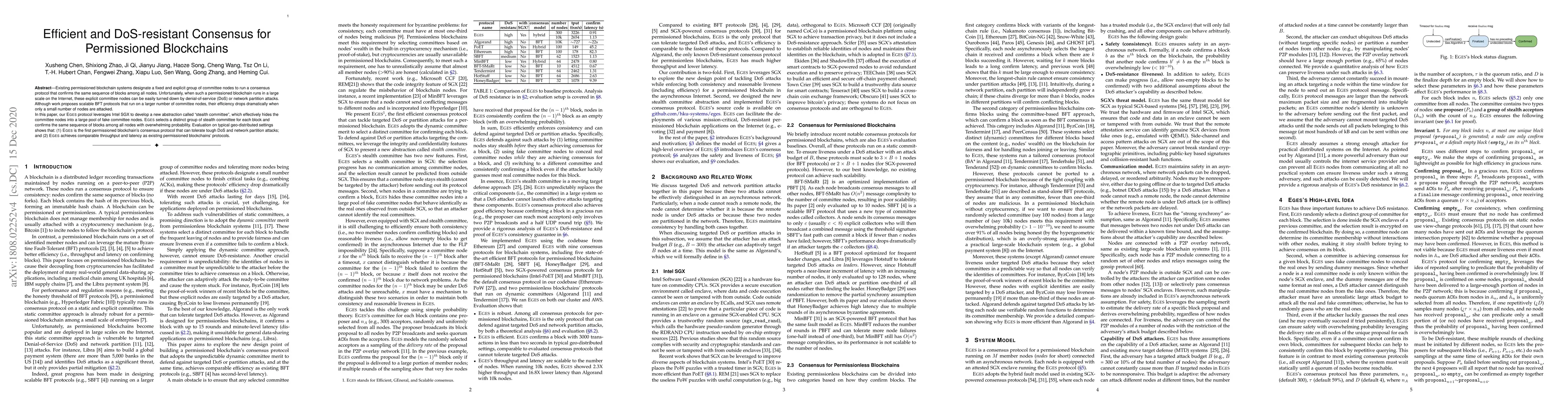This paper introduces the EGES protocol for permissioned blockchains, which uses Intel SGX to create a "stealth committee" to enhance DoS resistance and maintain efficiency even when a small number of nodes are attacked. EGES effectively hides real committee nodes within a larger pool, achieving comparable throughput and latency while tolerating severe DoS and network partition attacks.