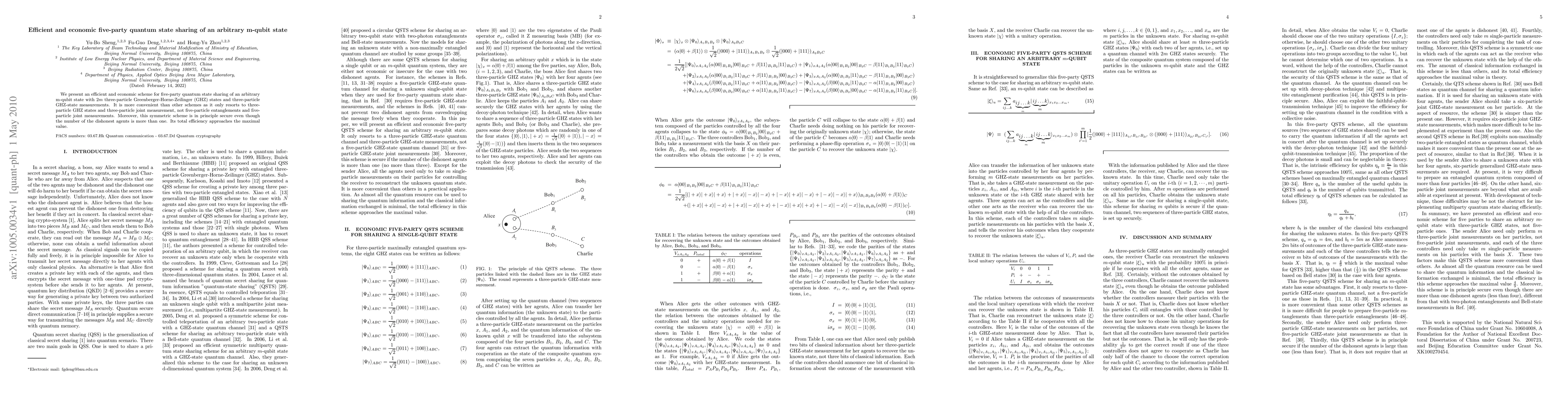 This paper proposes an efficient and cost-effective five-party quantum state sharing scheme using $2m$ three-particle GHZ states and three-particle joint measurements, avoiding the need for five-particle entanglements and joint measurements. The scheme is secure even with multiple dishonest agents and approaches maximum efficiency.