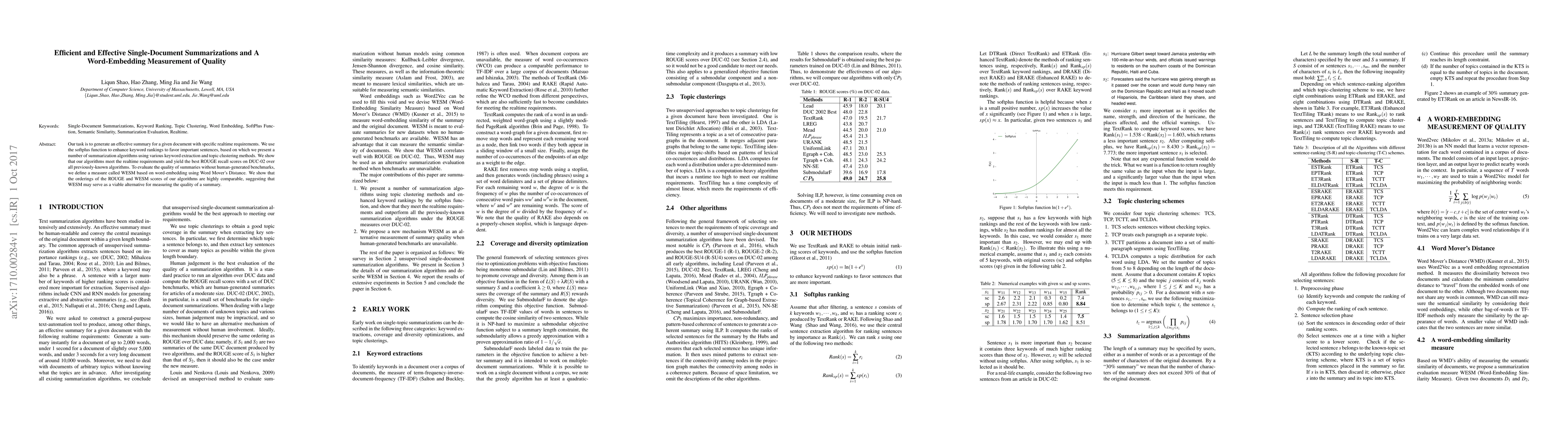 Our task is to generate an effective summary for a given document with specific realtime requirements. We use the softplus function to enhance keyword rankings to favor important sentences, based on which we present a number of summarization algorithms using various keyword extraction and topic clustering methods. We show that our algorithms meet the realtime requirements and yield the best ROUGE recall scores on DUC-02 over all previously-known algorithms. We show that our algorithms meet the realtime requirements and yield the best ROUGE recall scores on DUC-02 over all previously-known algorithms. To evaluate the quality of summaries without human-generated benchmarks, we define a measure called WESM based on word-embedding using Word Mover's Distance. We show that the orderings of the ROUGE and WESM scores of our algorithms are highly comparable, suggesting that WESM may serve as a viable alternative for measuring the quality of a summary.