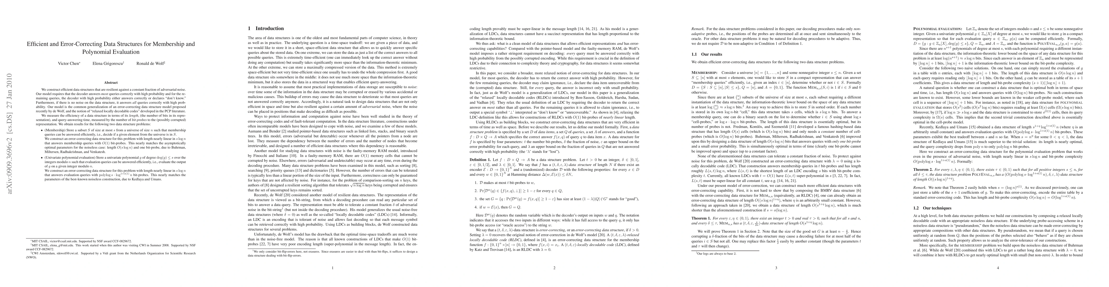 We construct efficient data structures that are resilient against a constant fraction of adversarial noise. Our model requires that the decoder answers most queries correctly with high probability and for the remaining queries, the decoder with high probability either answers correctly or declares "don't know." Furthermore, if there is no noise on the data structure, it answers all queries correctly with high probability. Our model is the common generalization of a model proposed recently by de Wolf and the notion of "relaxed locally decodable codes" developed in the PCP literature. We measure the efficiency of a data structure in terms of its length, measured by the number of bits in its representation, and query-answering time, measured by the number of bit-probes to the (possibly corrupted) representation. In this work, we study two data structure problems: membership and polynomial evaluation. We show that these two problems have constructions that are simultaneously efficient and error-correcting.