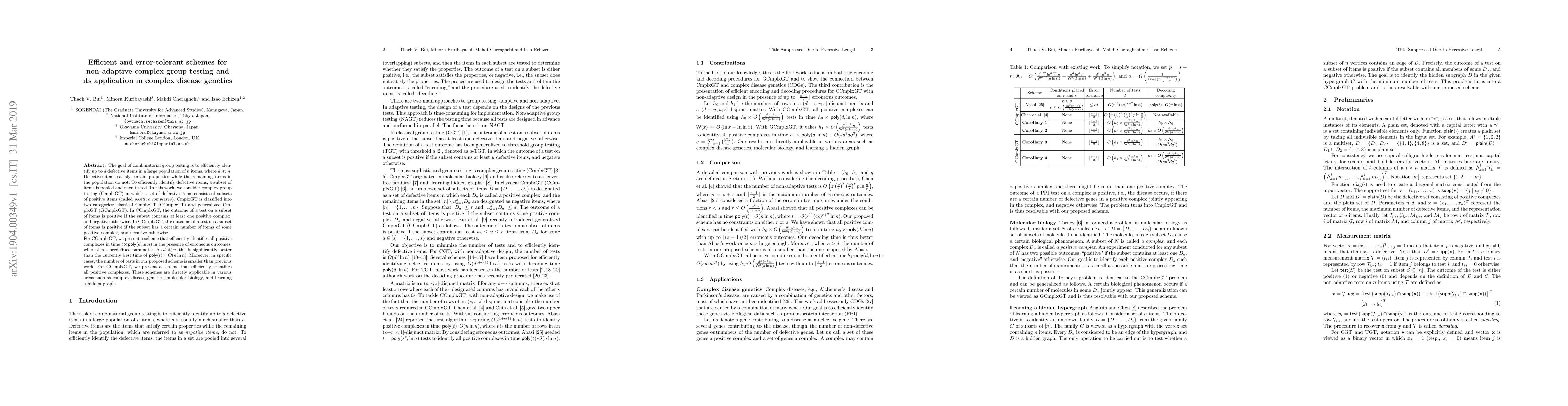The goal of combinatorial group testing is to efficiently identify up to $d$ defective items in a large population of $n$ items, where $d \ll n$. Defective items satisfy certain properties while the remaining items in the population do not. To efficiently identify defective items, a subset of items is pooled and then tested. In this work, we consider complex group testing (CmplxGT) in which a set of defective items consists of subsets of positive items (called \textit{positive complexes}). CmplxGT is classified into two categories: classical CmplxGT (CCmplxGT) and generalized CmplxGT (GCmplxGT). In CCmplxGT, the outcome of a test on a subset of items is positive if the subset contains at least one positive complex, and negative otherwise. In GCmplxGT, the outcome of a test on a subset of items is positive if the subset has a certain number of items of some positive complex, and negative otherwise. For CCmplxGT, we present a scheme that efficiently identifies all positive complexes in time $t \times \mathrm{poly}(d, \ln{n})$ in the presence of erroneous outcomes, where $t$ is a predefined parameter. As $d \ll n$, this is significantly better than the currently best time of $\mathrm{poly}(t) \times O(n \ln{n})$. Moreover, in specific cases, the number of tests in our proposed scheme is smaller than previous work. For GCmplxGT, we present a scheme that efficiently identifies all positive complexes. These schemes are directly applicable in various areas such as complex disease genetics, molecular biology, and learning a hidden graph.