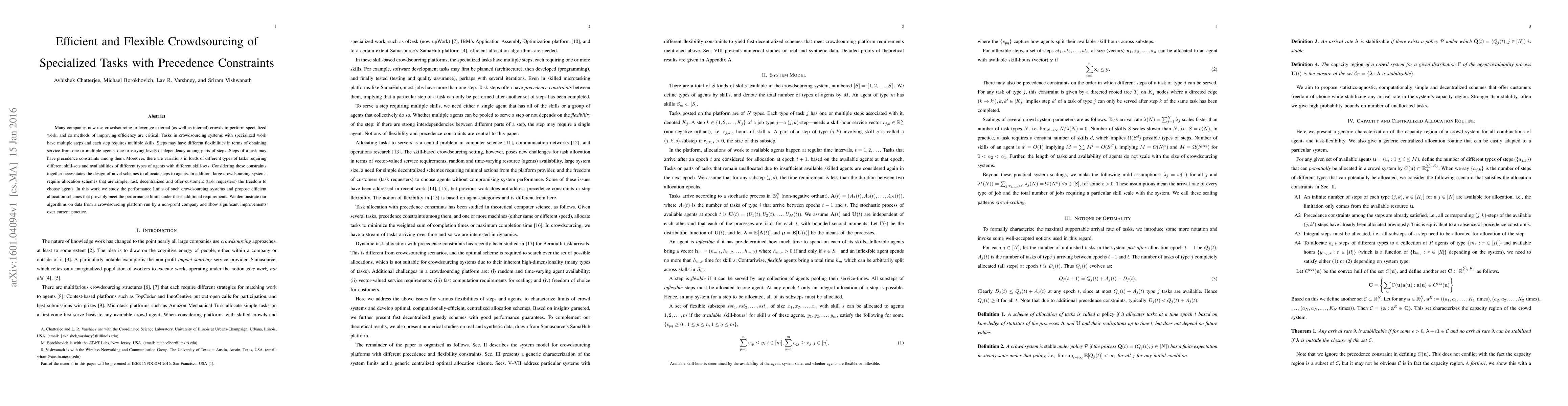 Many companies now use crowdsourcing to leverage external (as well as internal) crowds to perform specialized work, and so methods of improving efficiency are critical. Tasks in crowdsourcing systems with specialized work have multiple steps and each step requires multiple skills. Steps may have different flexibilities in terms of obtaining service from one or multiple agents, due to varying levels of dependency among parts of steps. Steps of a task may have precedence constraints among them. Moreover, there are variations in loads of different types of tasks requiring different skill-sets and availabilities of different types of agents with different skill-sets. Considering these constraints together necessitates the design of novel schemes to allocate steps to agents. In addition, large crowdsourcing systems require allocation schemes that are simple, fast, decentralized and offer customers (task requesters) the freedom to choose agents. In this work we study the performance limits of such crowdsourcing systems and propose efficient allocation schemes that provably meet the performance limits under these additional requirements. We demonstrate our algorithms on data from a crowdsourcing platform run by a non-profit company and show significant improvements over current practice.