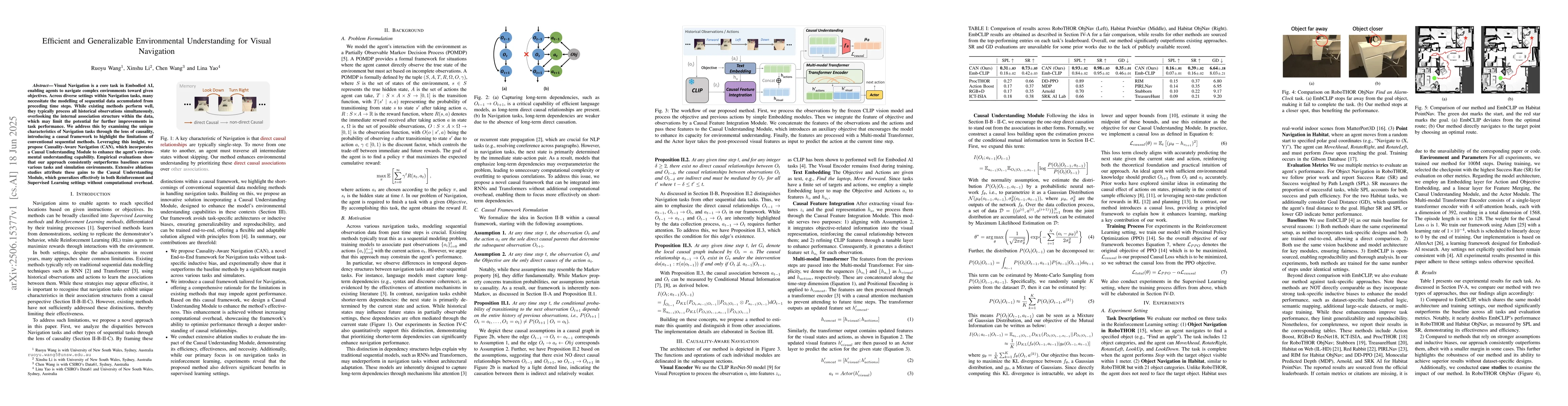 Visual Navigation is a core task in Embodied AI, enabling agents to navigate complex environments toward given objectives. Across diverse settings within Navigation tasks, many necessitate the modelling of sequential data accumulated from preceding time steps. While existing methods perform well, they typically process all historical observations simultaneously, overlooking the internal association structure within the data, which may limit the potential for further improvements in task performance. We address this by examining the unique characteristics of Navigation tasks through the lens of causality, introducing a causal framework to highlight the limitations of conventional sequential methods. Leveraging this insight, we propose Causality-Aware Navigation (CAN), which incorporates a Causal Understanding Module to enhance the agent's environmental understanding capability. Empirical evaluations show that our approach consistently outperforms baselines across various tasks and simulation environments. Extensive ablations studies attribute these gains to the Causal Understanding Module, which generalizes effectively in both Reinforcement and Supervised Learning settings without computational overhead.