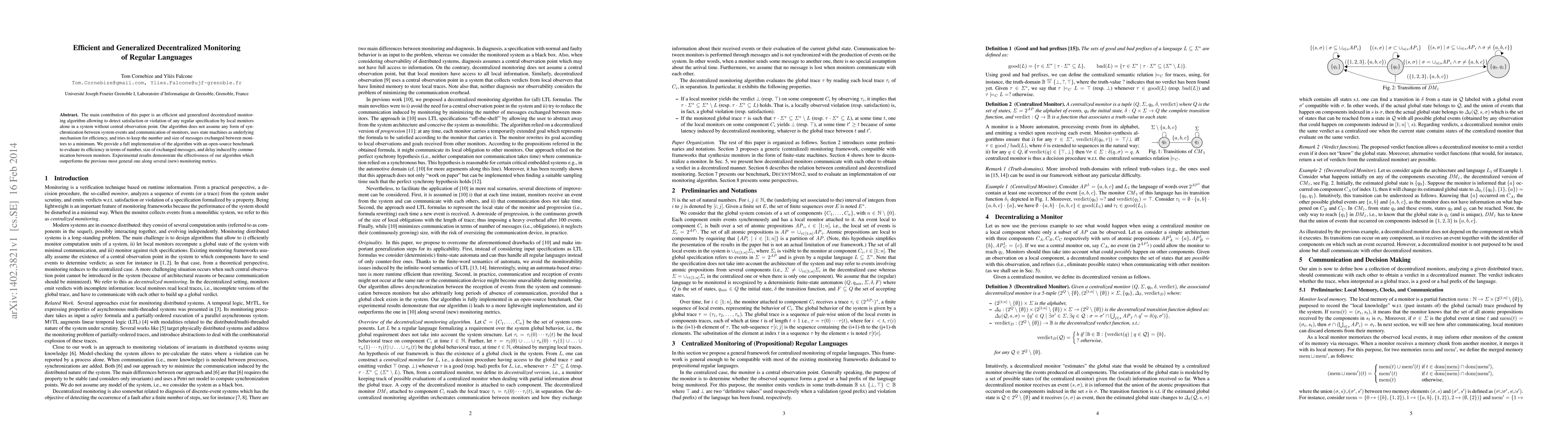A new decentralized monitoring algorithm is introduced for detecting satisfaction or violation of regular specifications in a system without a central observation point. The algorithm outperforms previous methods in terms of message exchange size, delay, and efficiency.