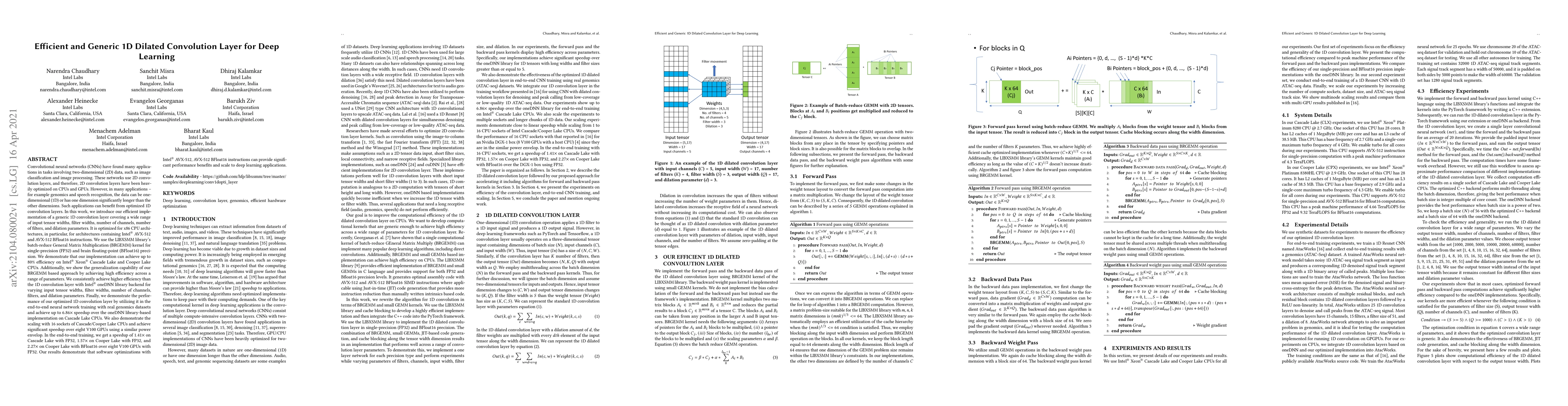 This paper presents an efficient and generic 1D dilated convolution layer optimized for x86 CPUs, particularly leveraging Intel AVX-512 and BFloat16 instructions. The implementation achieves up to 80% efficiency on Intel CPUs and demonstrates significant speedups over existing libraries in genomics and speech recognition applications.