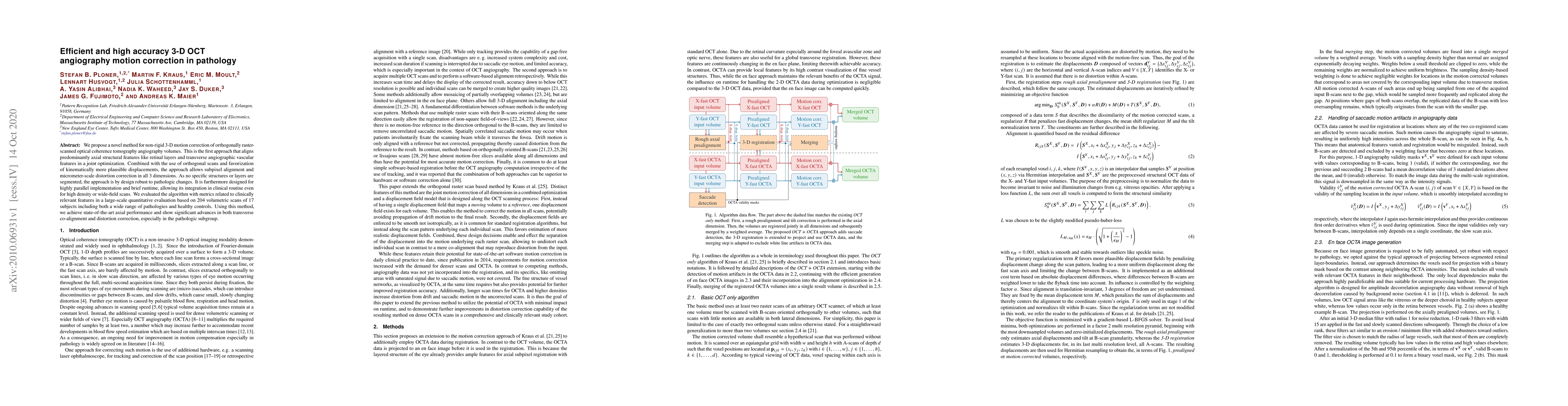 This paper introduces a novel method for correcting 3-D motion in OCT angiography volumes, aligning both structural and angiographic features. The approach, evaluated on 204 scans from 17 subjects, achieves high accuracy, robustness to pathologic changes, and efficient runtime, promising clinical integration for various scan types.