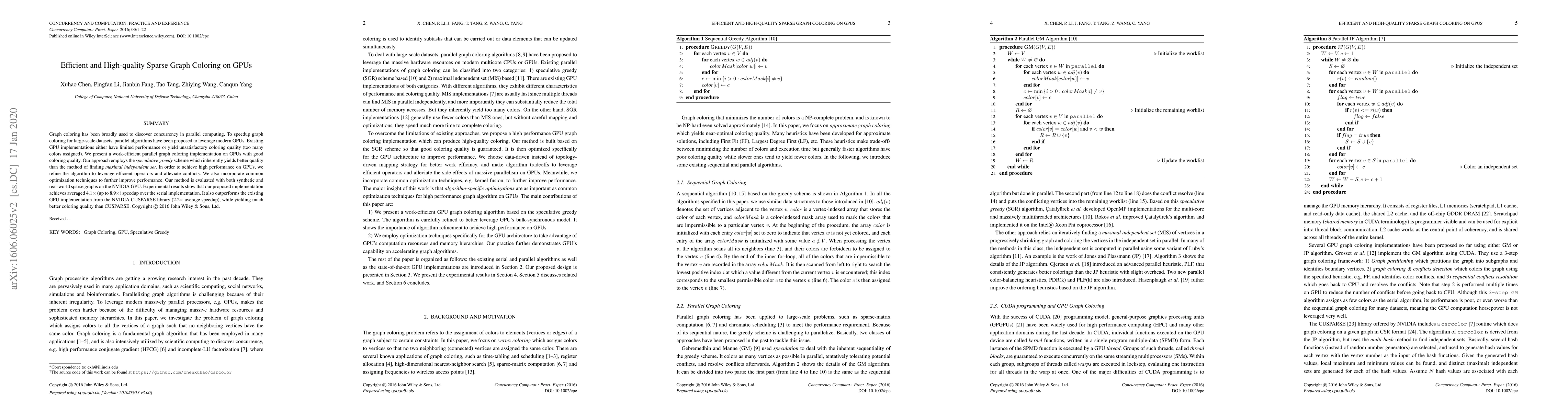 This paper presents an efficient and high-quality parallel GPU implementation for sparse graph coloring, employing a speculative greedy scheme to achieve better coloring quality. The refined algorithm leverages efficient GPU operators and optimizations, resulting in up to 8.9x speedup over serial implementations and significantly better quality compared to existing GPU methods.