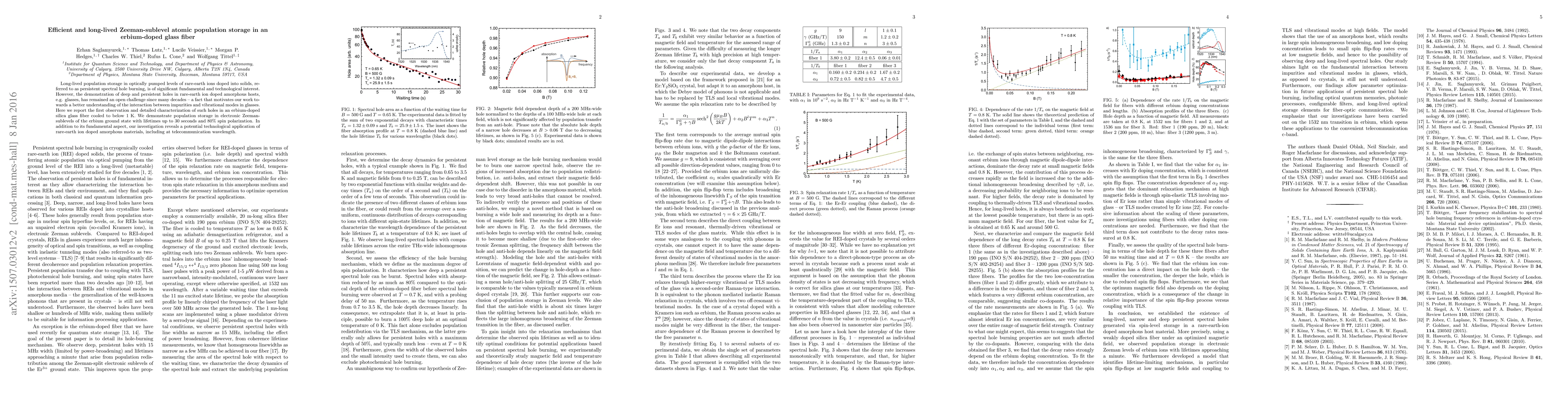 This paper reports the first observation of long-lived population storage in erbium-doped silica glass fiber, achieving Zeeman-sublevel storage with up to 30-second lifetimes and 80% spin polarization, highlighting both fundamental insights and potential for telecommunication applications.