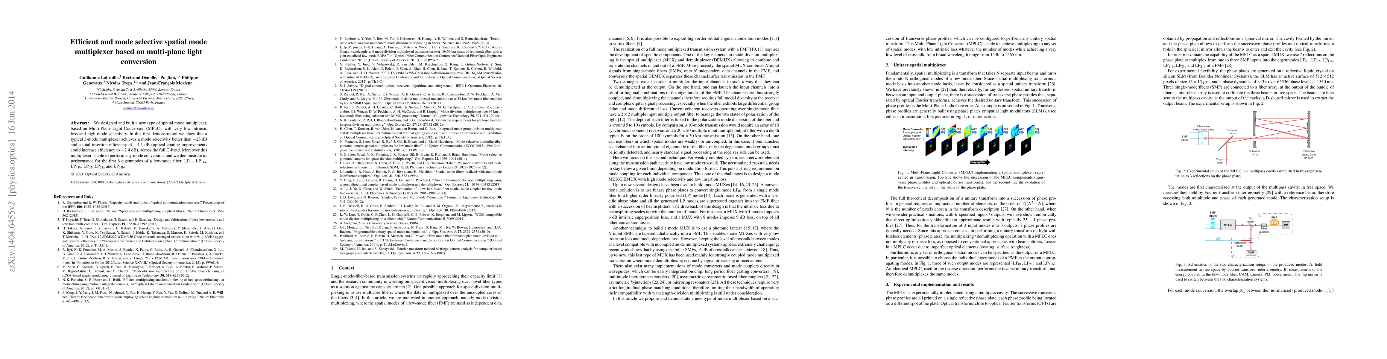 We designed and built a new type of spatial mode multiplexer, based on Multi-Plane Light Conversion (MPLC), with very low intrinsic loss and high mode selectivity. In this first demonstration we show that a typical 3-mode multiplexer achieves a mode selectivity better than -23 dB and a total insertion efficiency of -4.1 dB (optical coating improvements could increase efficiency to -2.4 dB), across the full C-band. Moreover this multiplexer is able to perform any mode conversion, and we demonstrate its performance for the first 6 eigenmodes of a few-mode fiber: LP$_{01}$, LP$_{11\mathrm{a}}$, LP$_{11\mathrm{b}}$, LP$_{02}$, LP$_{21\mathrm{a}}$ and LP$_{21\mathrm{b}}$.