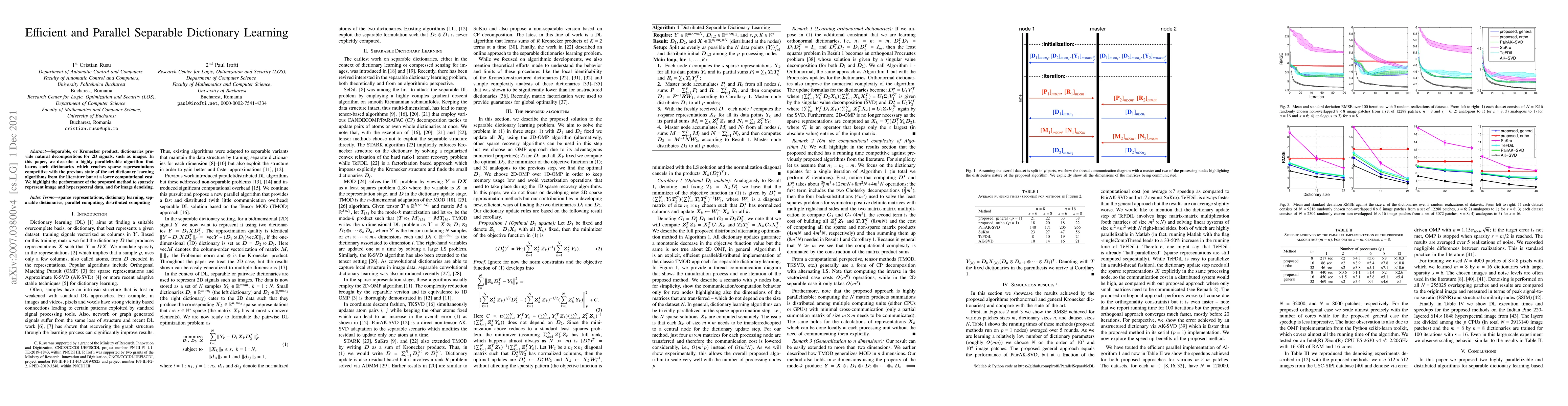 This paper presents a highly parallelizable algorithm for learning separable dictionaries, achieving competitive sparse representations for 2D signals like images at lower computational costs. The method demonstrates effective performance in representing image and hyperspectral data, as well as in image denoising tasks.