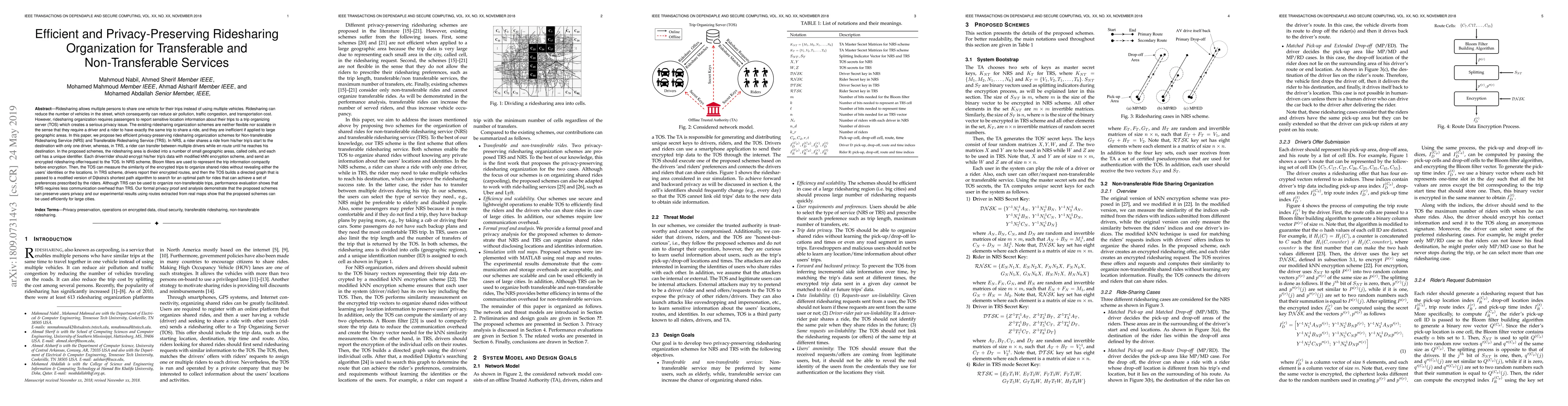 This paper proposes two efficient, privacy-preserving ride-sharing schemes for both Non-transferable and Transferable Ride-sharing Services. It addresses privacy concerns and inflexibility by dividing the ride-sharing area into cells, using encryption and Bloom filters for NRS, and a modified Dijkstra's algorithm for TRS.