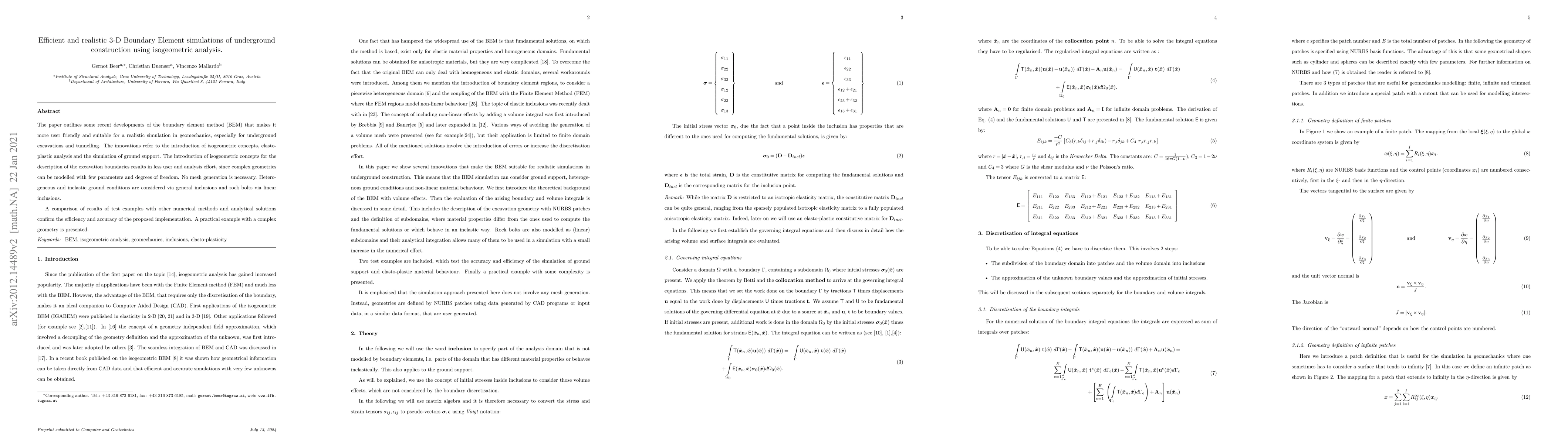 The paper outlines some recent developments of the boundary element method (BEM) that makes it more user friendly and suitable for a realistic simulation in geomechanics, especially for underground excavations and tunnelling. The innovations refer to the introduction of isogeometric concepts, elasto-plastic analysis and the simulation of ground support. The introduction of isogeometric concepts for the description of the excavation boundaries results in less user and analysis effort, since complex geometries can be modelled with few parameters and degrees of freedom. No mesh generation is necessary. In order to consider heterogeneous and inelastic ground conditions a domain discretisation is used but the use of isogeometric methods results in a minimum of user effort. Efficient methods are also presented for modelling rock bolts. A comparison of results of test examples with other numerical methods and analytical solutions confirm the efficiency and accuracy of the proposed implementation. A practical example with a complex geometry is presented.
