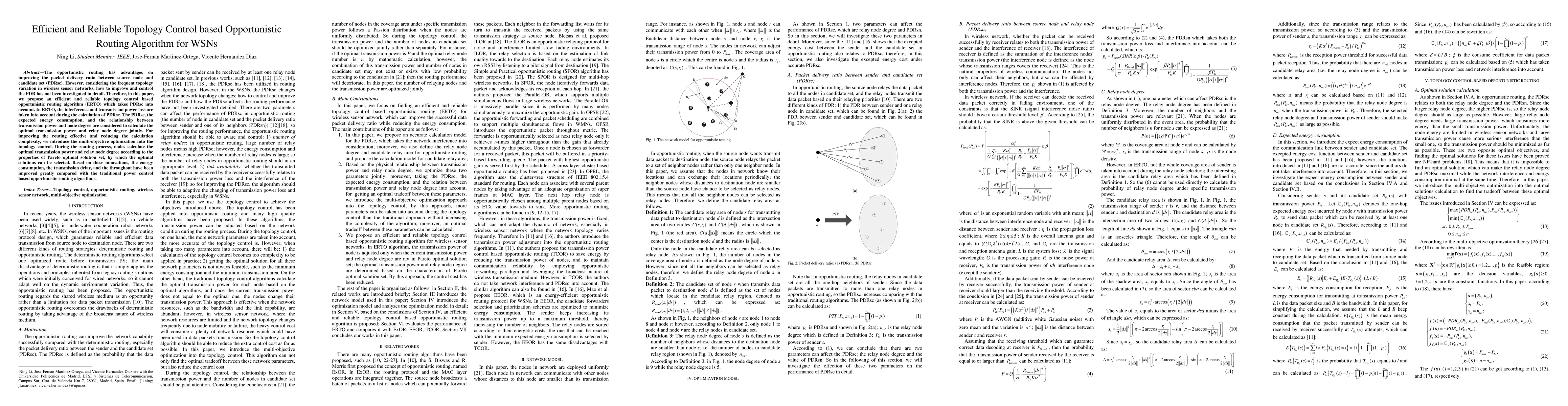This paper proposes an efficient and reliable topology control-based opportunistic routing algorithm (ERTO) for wireless sensor networks, aiming to improve packet delivery ratio by considering interference, transmission power loss, and energy consumption. The algorithm optimizes transmission power and relay node degree using multi-objective optimization, significantly enhancing energy efficiency, transmission delay, and throughput compared to traditional methods.
