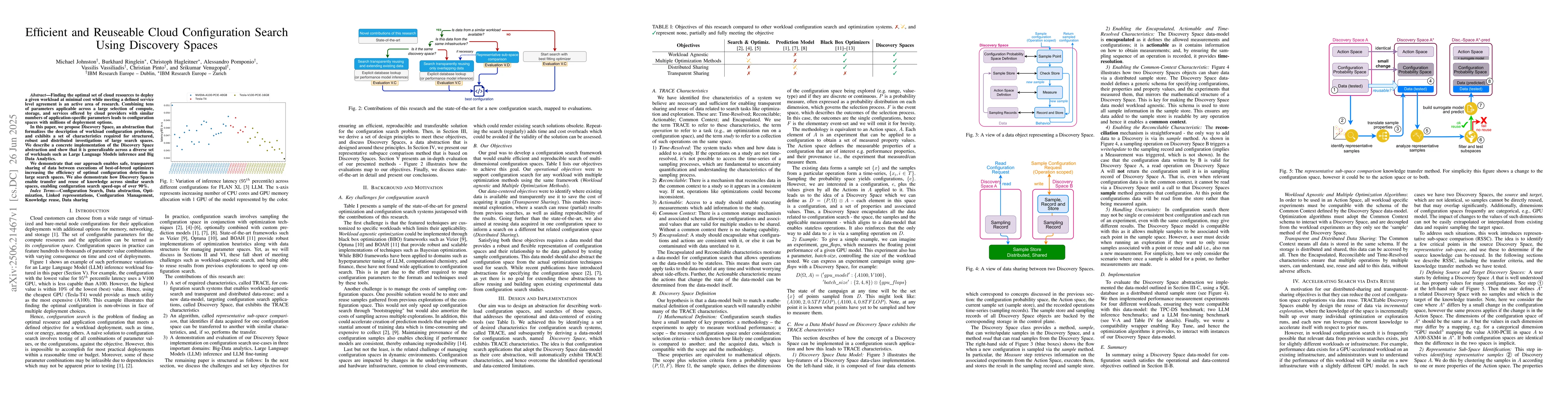 Finding the optimal set of cloud resources to deploy a given workload at minimal cost while meeting a defined service level agreement is an active area of research. Combining tens of parameters applicable across a large selection of compute, storage, and services offered by cloud providers with similar numbers of application-specific parameters leads to configuration spaces with millions of deployment options. In this paper, we propose Discovery Space, an abstraction that formalizes the description of workload configuration problems, and exhibits a set of characteristics required for structured, robust and distributed investigations of large search spaces. We describe a concrete implementation of the Discovery Space abstraction and show that it is generalizable across a diverse set of workloads such as Large Language Model inference and Big Data Analytics. We demonstrate that our approach enables safe, transparent sharing of data between executions of best-of-breed optimizers increasing the efficiency of optimal configuration detection in large search spaces. We also demonstrate how Discovery Spaces enable transfer and reuse of knowledge across similar search spaces, enabling configuration search speed-ups of over 90%.